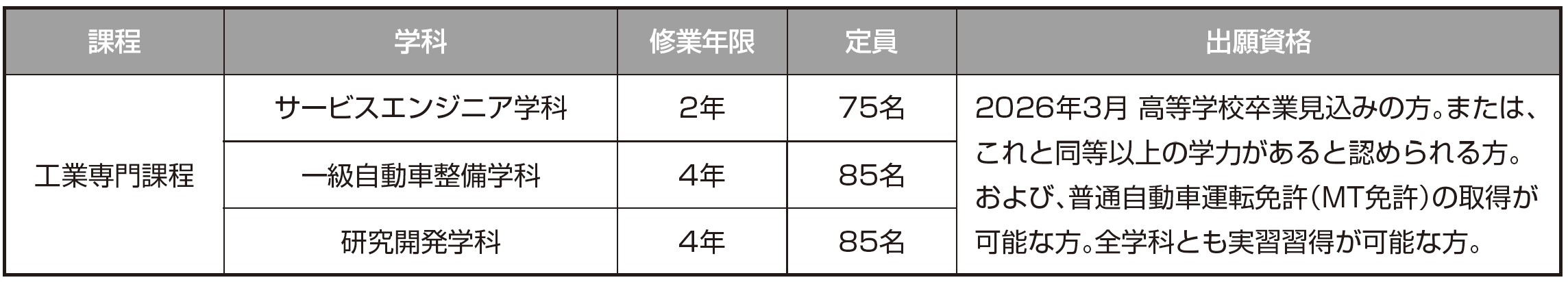 | エントリー資格 | 将来は自動車分野へ就職を希望し、自動車分野にかかわらず、今までに何かチャレンジをした経験、もしくは他に誇れる能力や資格、