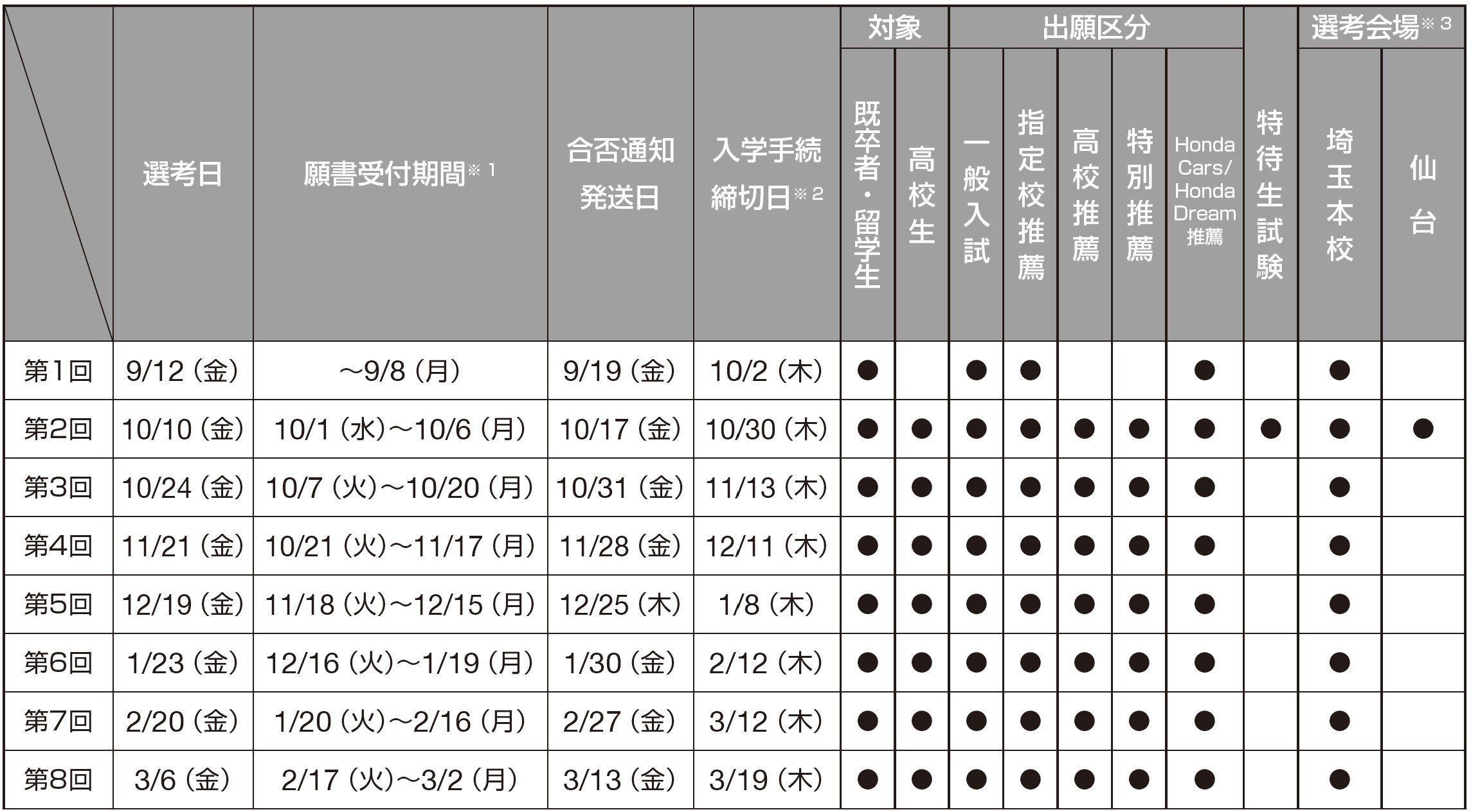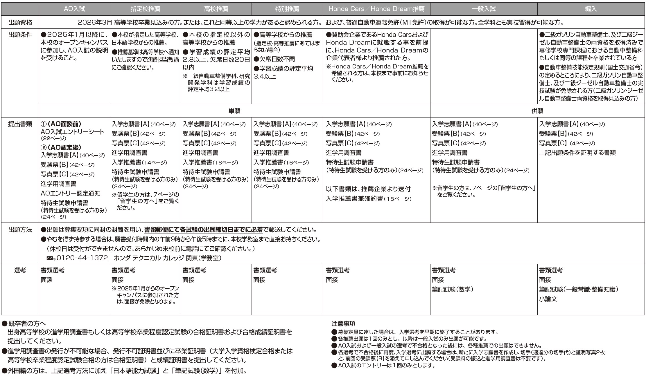 | AO入試で求める人物像 | ホンダ学園の建学の精神に基づき「夢があり、夢に向かって努力できる、何事にも積極的にチャレンジできる」方 ①クルマやバイクが好きで、将来、自動車、バイク業界で活躍したい ②人間性が豊かで好奇心に充ち溢れている ③明るく活発で、何事にも積極的な取り組み姿勢がある ④夢があり、好きなことには何事にも努力できる ⑤他の人の意見を尊重し、周りへの気配りができる |