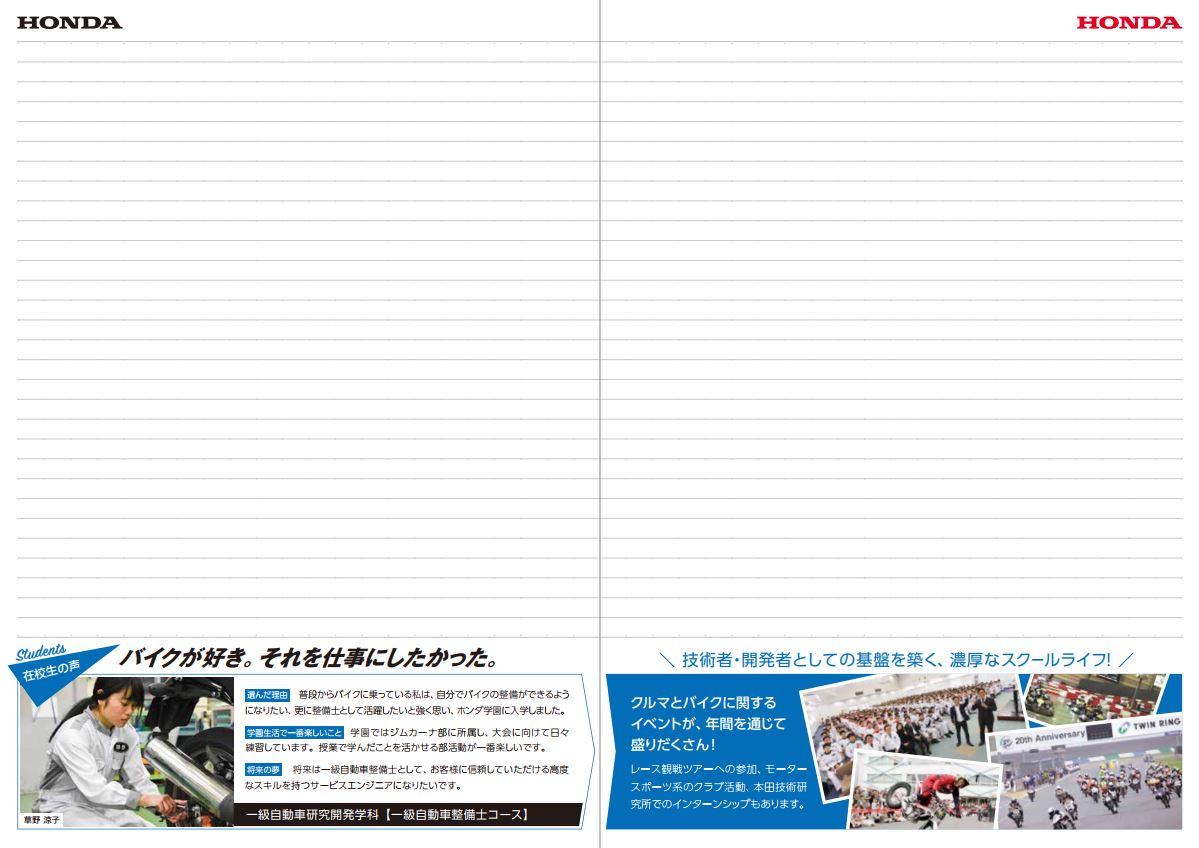 ノートでは、夏の体験授業・学校見学会の告知や、大学を選ばず、ホンダテクニカルカレッジ関東に進学した在校生、卒業生の生の声を掲載しております。