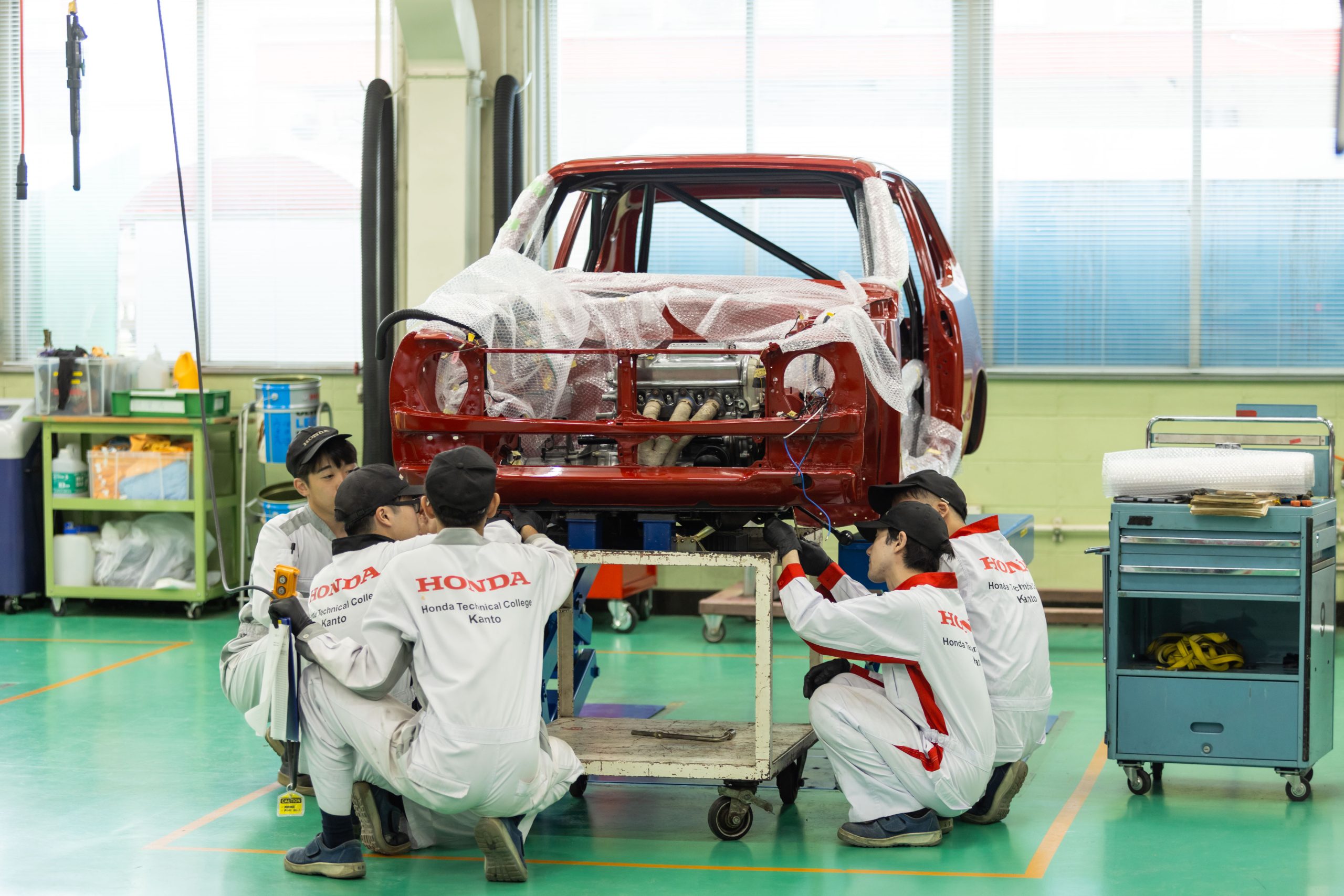 有志の学生たちが初代シビックRSを2台(1号車はサンセットオレンジ色・2号車はマドリードレッド色)レストアし、