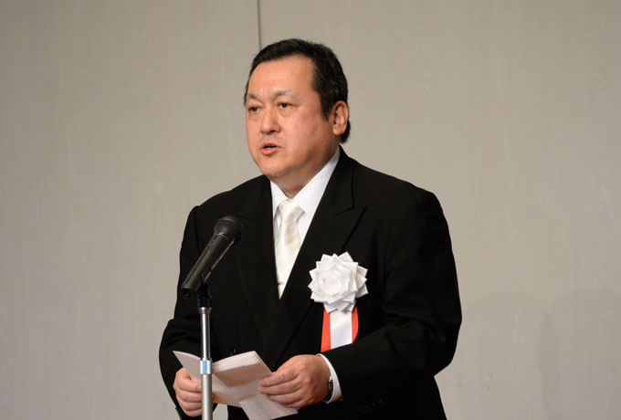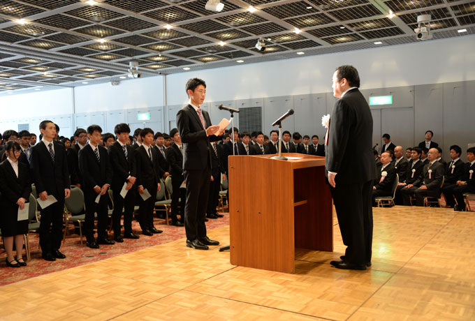 在校生代表挨拶。新しい仲間にお祝いの言葉を伝えました。