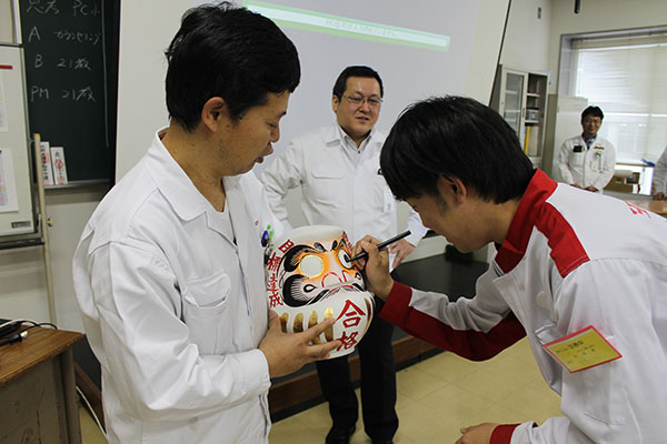 最後に、恒例の「だるまの眼入れ」で全員合格の祈願を行いました。