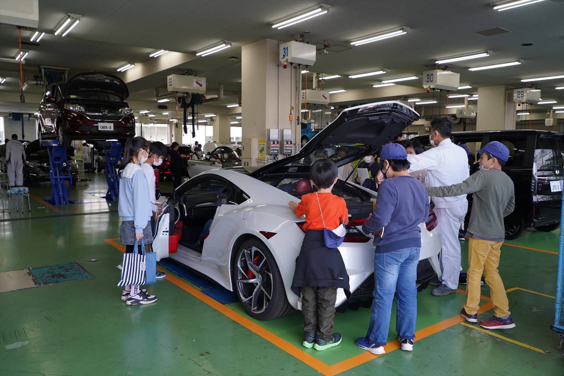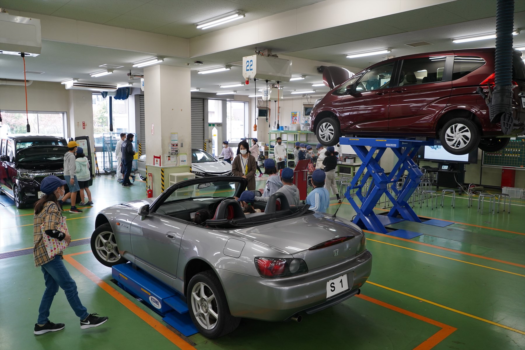 実習車をリフトで上げ、なかなか見られない車の下を見学したり、実際の車両に触れてみたり、いろいろな体験をしていただきました。