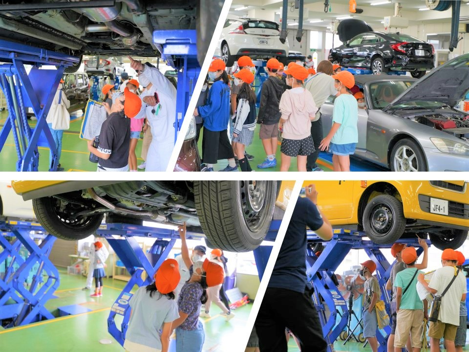 実習車をリフトで上げ、なかなか見られない車の下を見学したり、実際の車両に触れてみたり、いろいろな体験をしていただきました。
