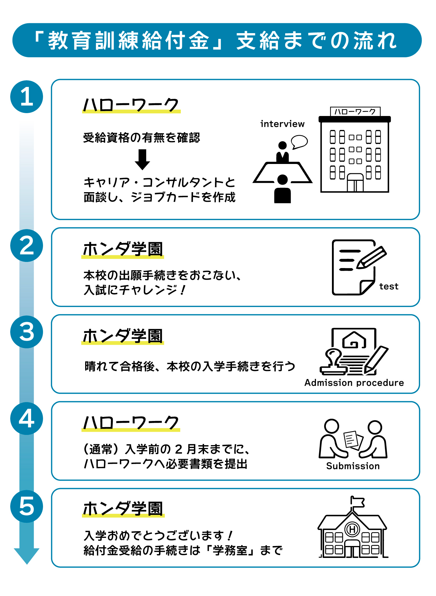 ホンダテクニカルカレッジ関東校のサービスエンジニア学科(2年課程)は、厚生労働省より教育訓練給付金の対象となる「専門実践教育給付金指定講座」に再認定されました。社会人の方・社会人だった方の学び直しに、国(ハローワーク)が支援してくれる制度です。自動車業界で活躍してみたい方は、ぜひこの制度を利用してホンダ学園で二級自動車整備士資格を取得しませんか。