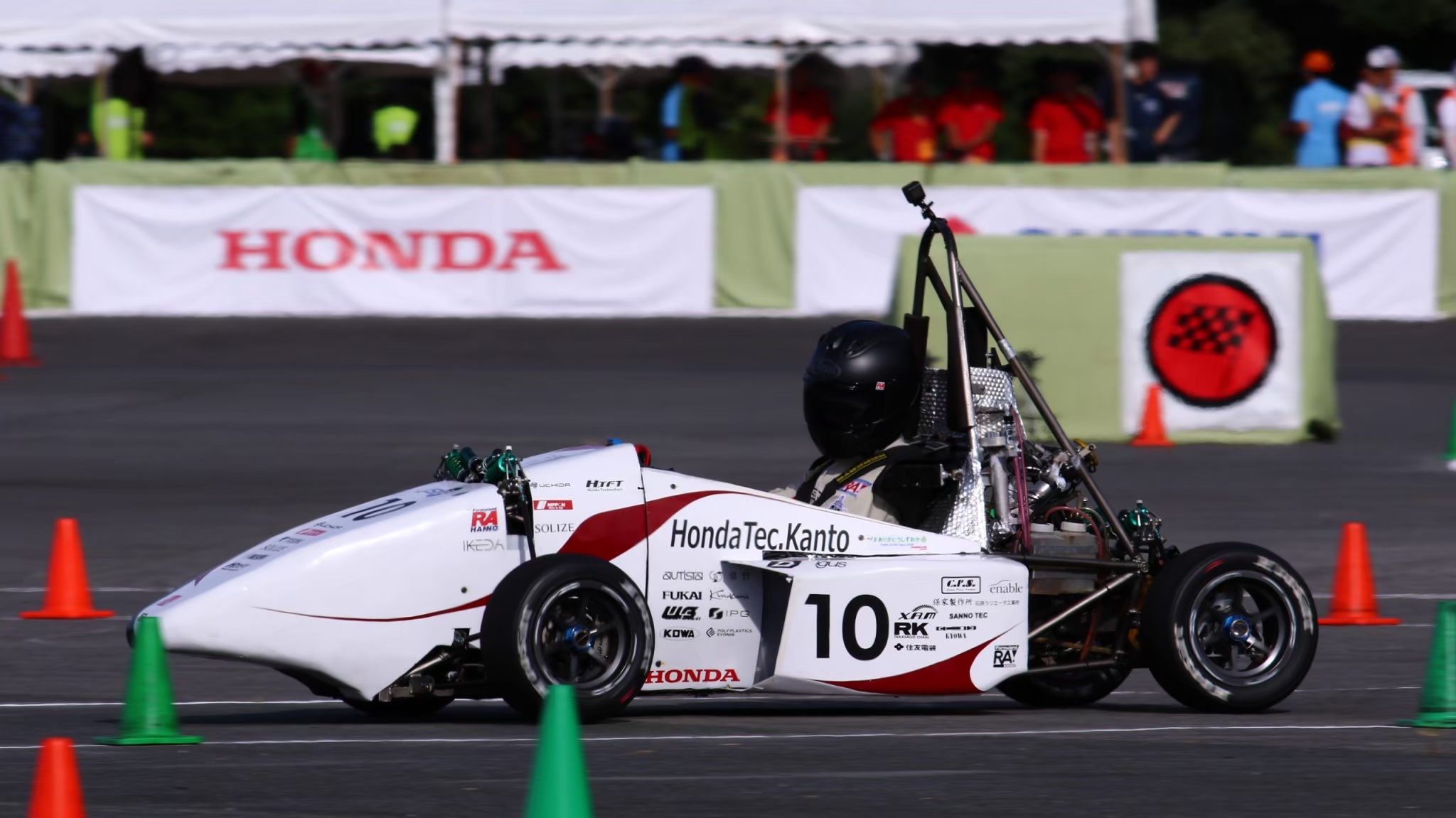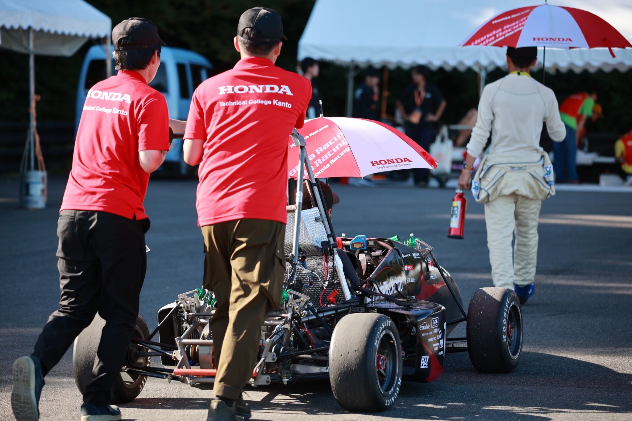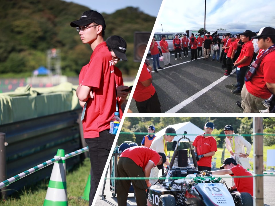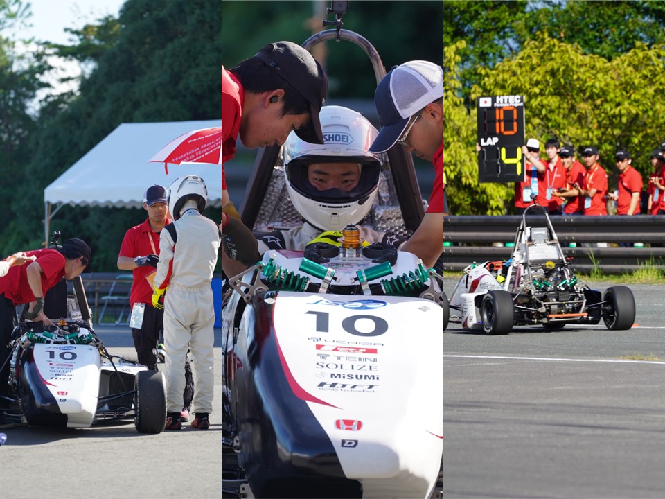 大会においては事前審査の結果により車検順番が遅れる事となり、動的競技への出場が危ぶまれる状況でしたが、OBによる模擬車検による指摘を元にマシンを修正し当日を迎え、短時間での合格を達成しました。