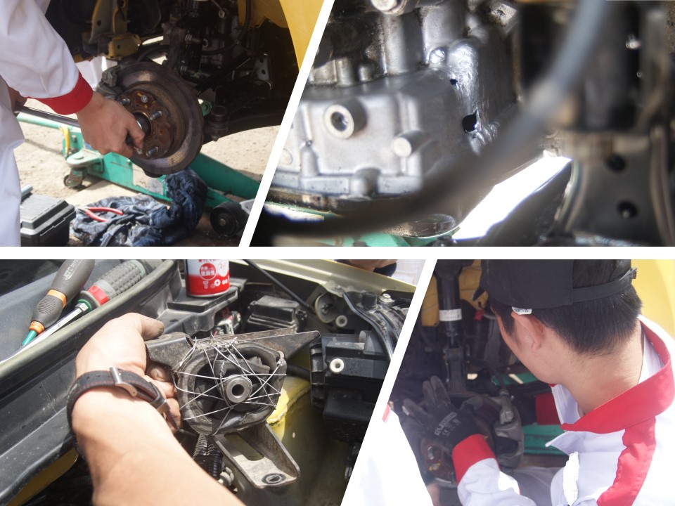- 完走を目指して車両の修理を行い、ミッションマウントやミッションケースの修理、スペアドライブシャフトへの交換を行いました。