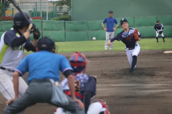 チャンスに凡退が続くも、絶対的エースの井上君(一級自動車研究開発3年生)がテンポのいい投球で流れを変える。