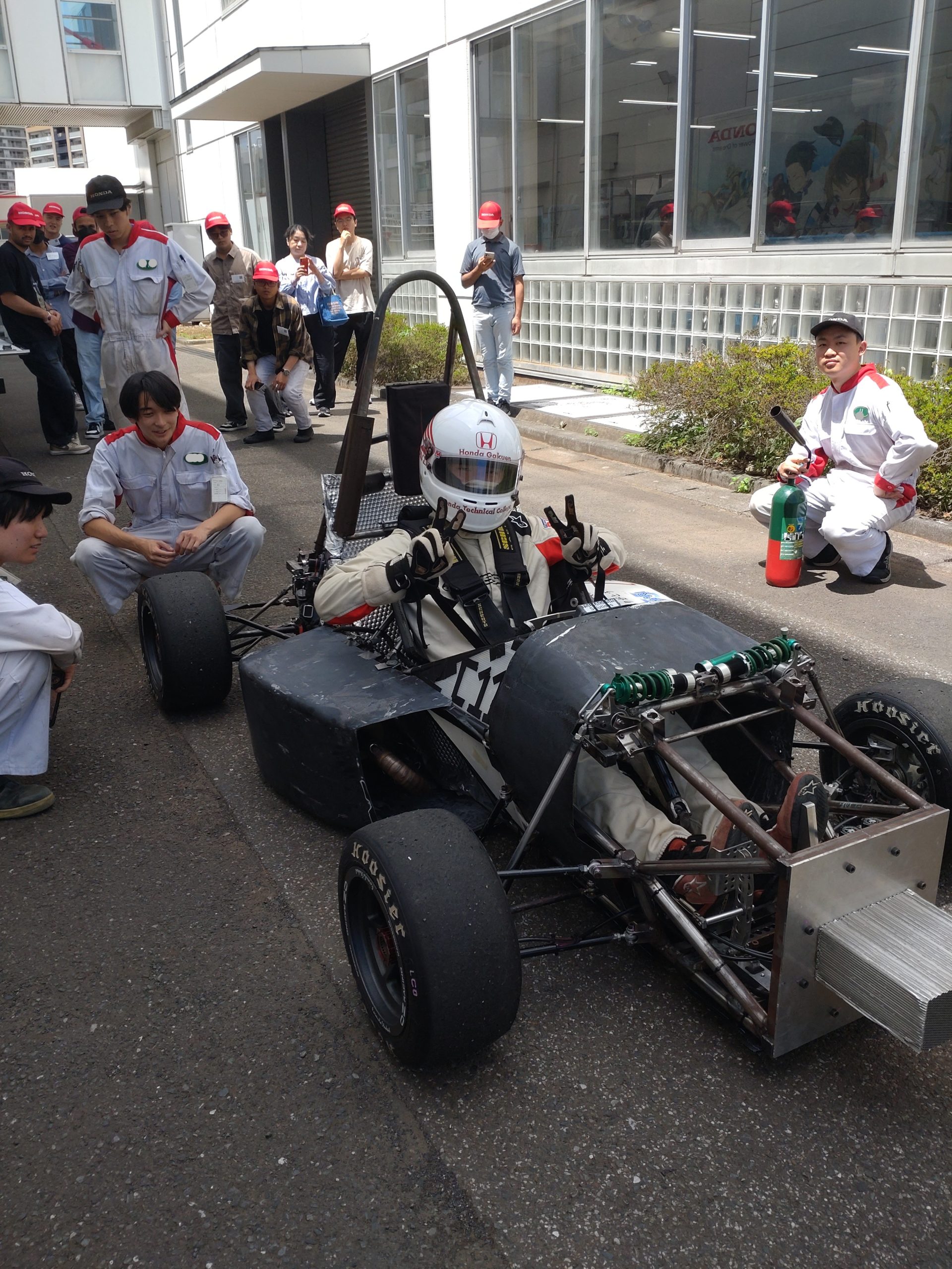 校内見学に行くとちょうどフォーミュラ部のマシンを調整していましたので、少し見せてもらいました。