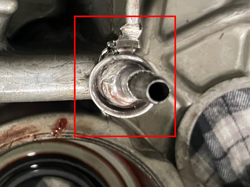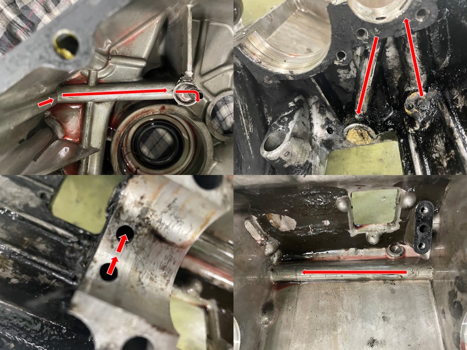 強制潤滑式を採用しているためトランスミッションケースには油路が設けられており赤矢印の方向にオイルが流れていく構造になっています!