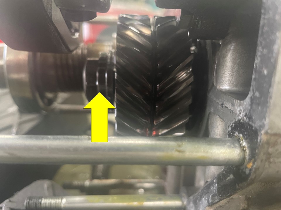 メインシャフトと呼ばれる所に取り付けられている二枚のギアを止めているボルト(黄色矢印)が緩んでいました。。。(汗)