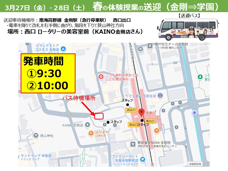 最寄駅の南海高野線:金剛駅より送迎車をご用意。駅改札付近に本校のスタッフが待機しております。