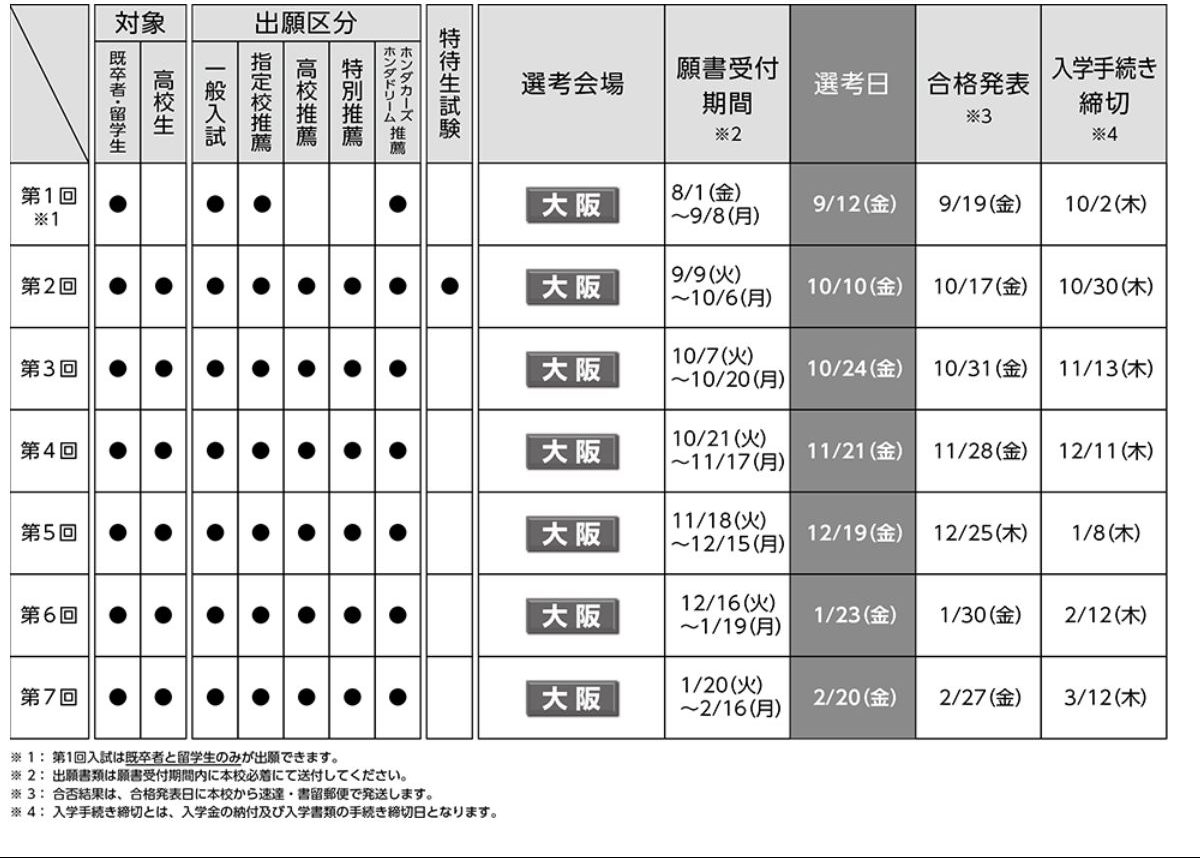 〇入試は10:00スタート(会場:ホンダ テクニカル カレッジ 関西) ※終了時刻は、受験者が多ければ遅くなります。念のため、昼食は各自でご持参ください。