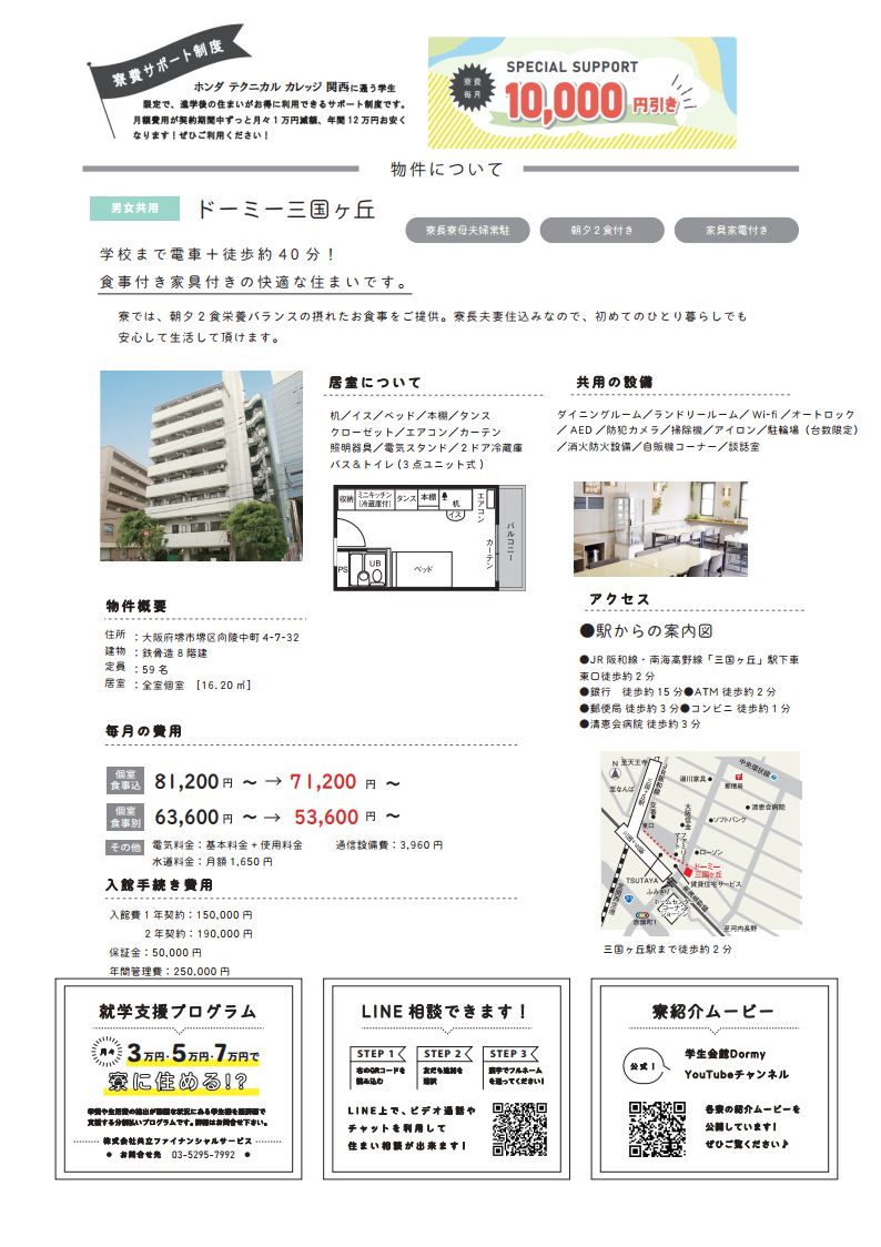 新たに、共立メンテナンス様のご協力を得て、南海高野線の三国ヶ丘駅から徒歩2分の場所にある「ドーミー三国ヶ丘」を本校の指定寮として登録をさせて頂くことになりました。学園生は、家賃がなんと1万円引きの特典(^^♪