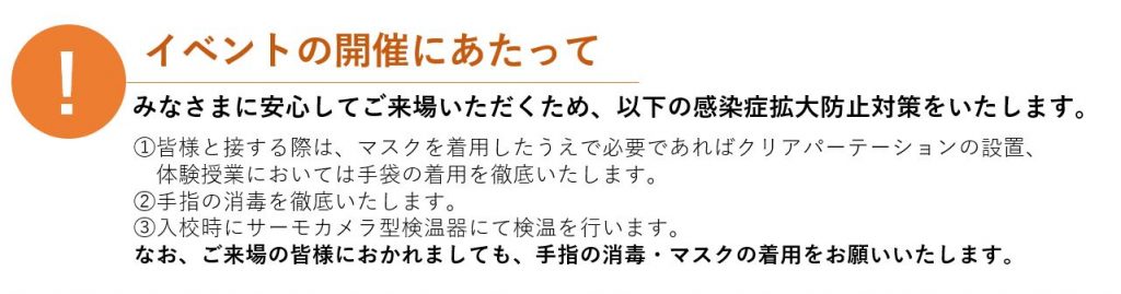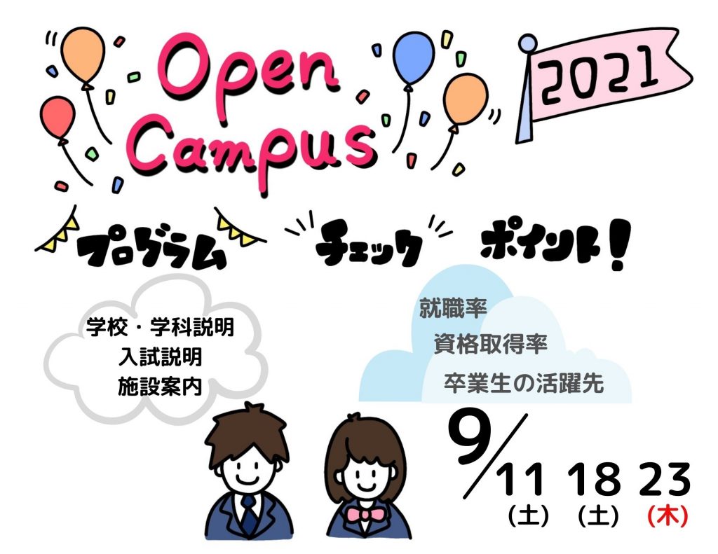 【お知らせ】9月のオープンキャンパス 2021.08.30 9月にもオープンキャンパス(対面式・ONLINE)ともに実施を致します。まだ進路が決まっていない方、今後の進路について考えてみたい方は、ぜひ対面式もしくはONLINEで開催するオープンキャンパスへご参加ください。 □対面式のオープンキャンパスのご予約はこちら □ONLINEのオープンキャンパスのご予約はこちら