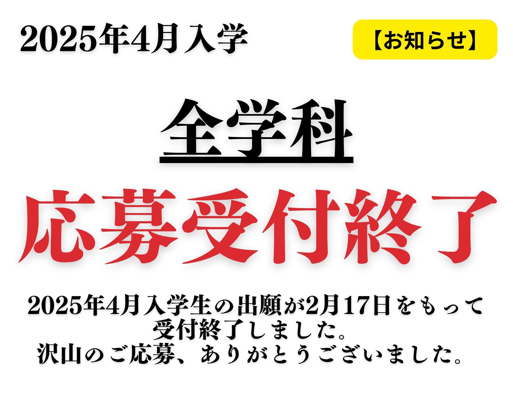 2025年4月入学生の最終入試を2月21日に無事に終えることができました。また、最終入試をもって、2025年4月入学生の全学科の応募受付も終了しました。全学科ともにたくさんのご応募、誠にありがとうございました。合格された皆さまのご入学を教職員一同、心よりお待ちしております。