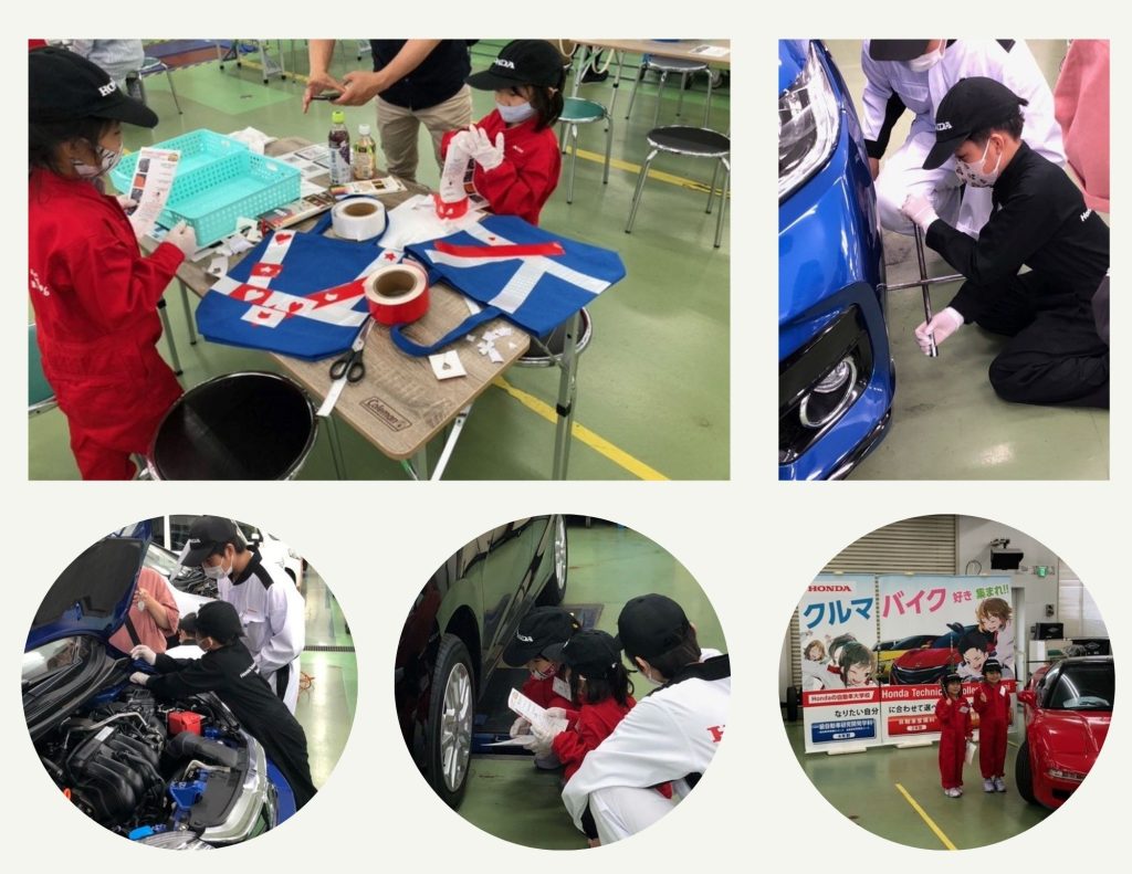 今回は、新たに1年生の在校生にも手伝ってもらい、参加していただいた小学生と一緒に『トートバッグ・クルマのクラフト』を制作したり、クルマの整備体験を実施しました。今回も小学生のたくさんの笑顔を見ることができました。