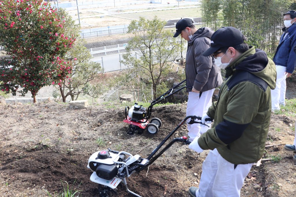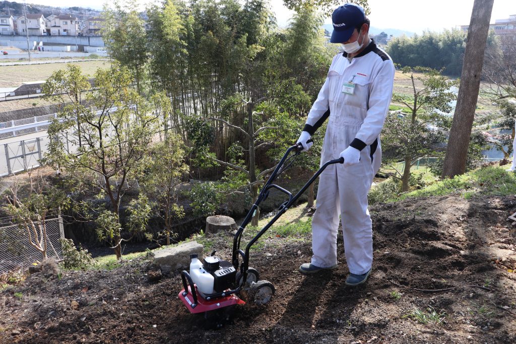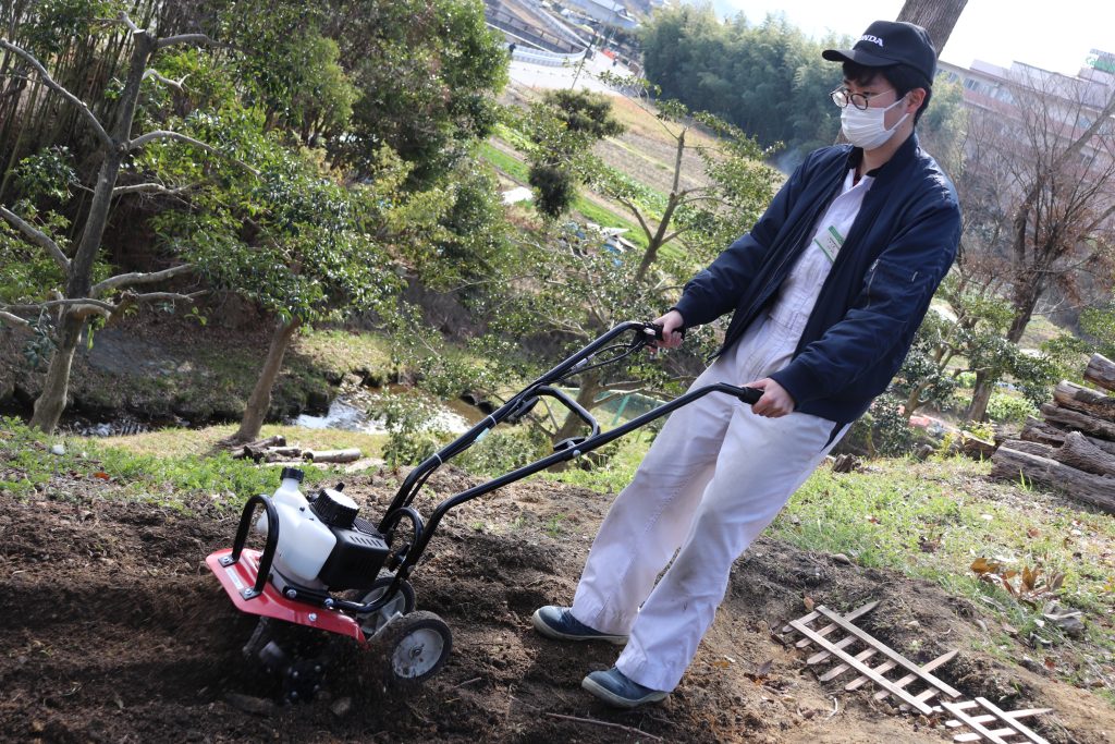 ホンダテクニカルカレッジ関西の校舎裏には、写真のように綺麗に間伐・整地された、自然いっぱいの場所があります。耕うん機を初めて動かしてみる学園生ばかりで、興味と感心、そして楽しさがたっぷり味わえる授業でした。