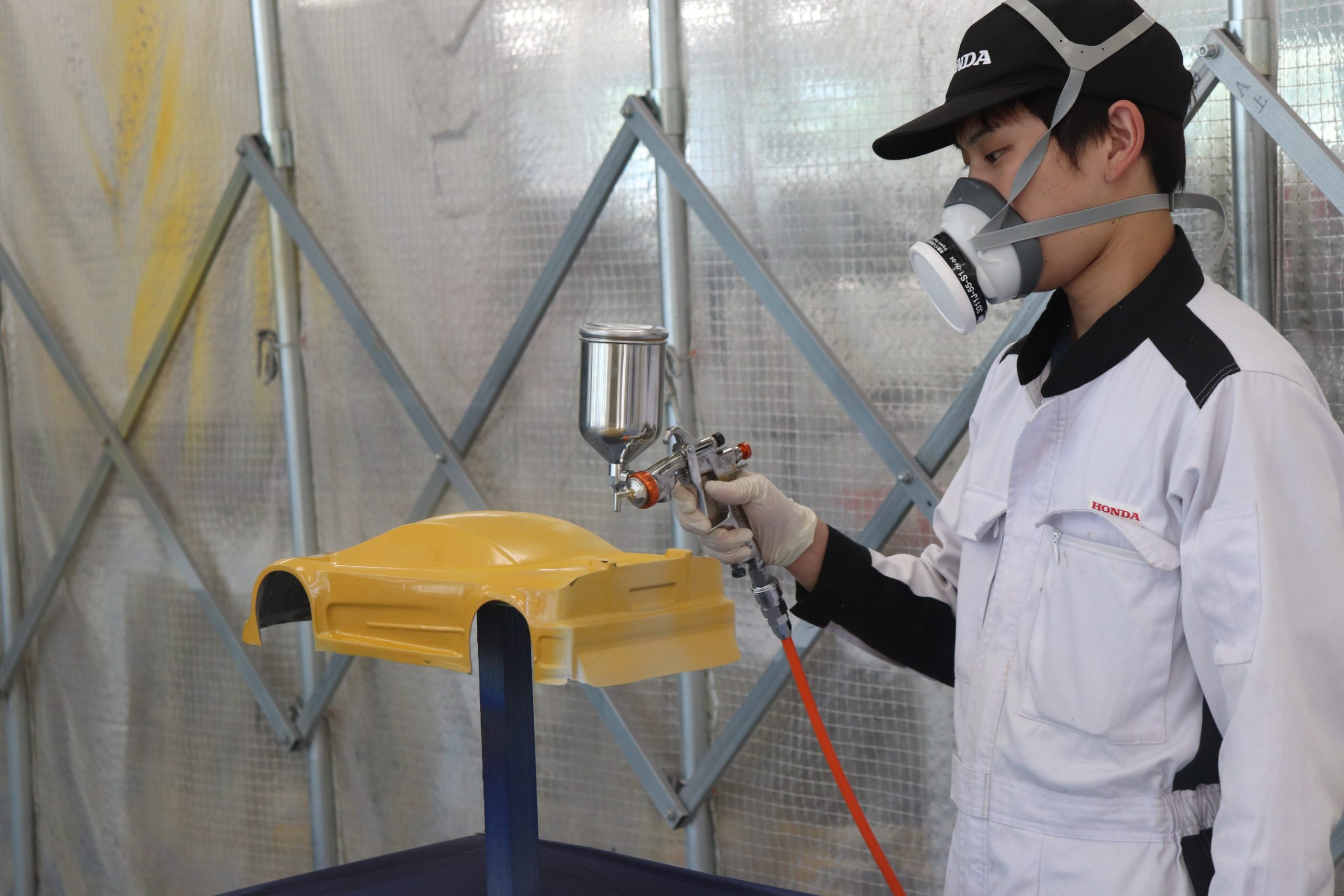 繊維にも種類があり、特にカーボンを使うものが強度が高く、F1などのレース車両に使われてます。また、学園にある教材車:NSXにもこのカーボンで作られているパーツがたくさんあります。今回はガラス繊維を使って、50cmほどの大きさの車の外装を3日間かけて作りました。