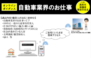 自宅にいながら、「自動車業界のお仕事や今後の環境変化、また、仕事のやりがいに高校のうちにやっておくべきこと」が学べる職業人講話*を開催いたします。