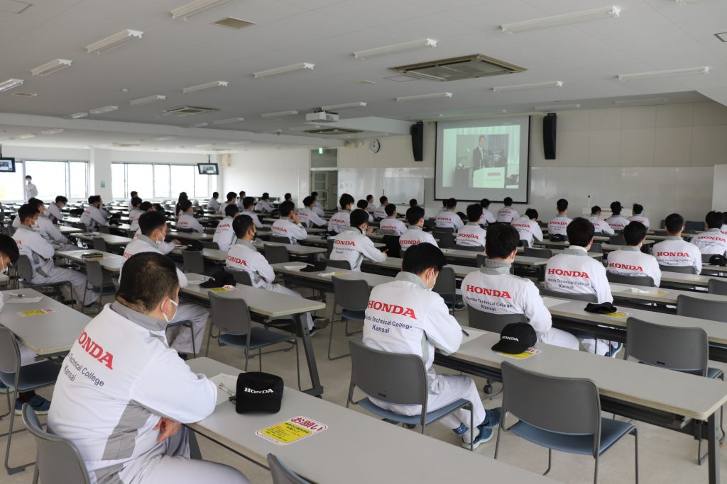 2月14日(月)に本田技術研究所の大津社長から「2050年カーボンニュートラルと事故ゼロに向けたHondaの取り組みと未来づくり」の講話をONLINEで実施していただきました。コロナ禍での開催でONLINEとなりましたが、本田技術研究所の現役社長である大津様の講話とあって、学生たちは熱心に聞き入り、メモをとっておりました。また、学生からの質問に対し、丁寧に受け答えしていただき、誠にありがとうございました。Hondaの自動車大学校でしかできない、〝トップセミナー″。Hondaが描く未来社会への展望が聞け、大変貴重な機会となりました。