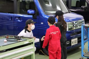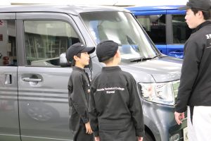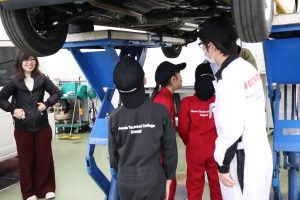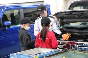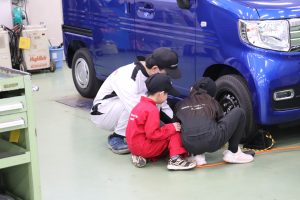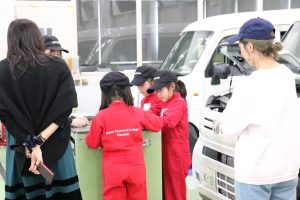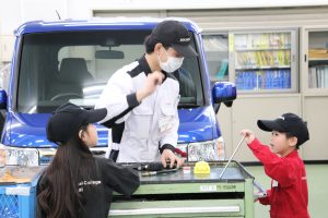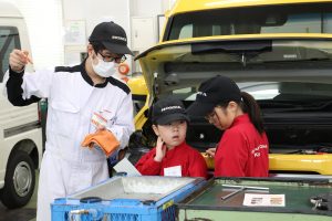 お子様がユニフォームに着替え、クルマの整備をしている姿を見て、保護者の方はいつも笑顔いっぱいです。また、先生役をしている学園生、教職員も毎回素晴らしい時間を過ごさせていただいております。