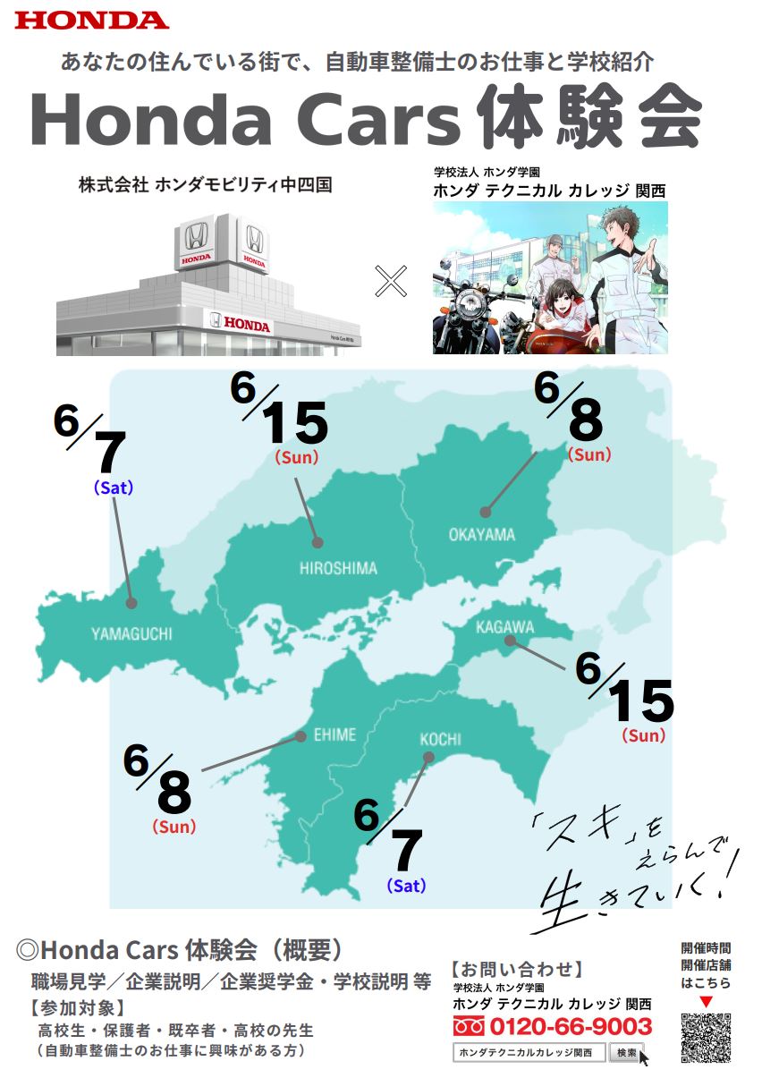 6月に中四国6県(岡山・広島・山口・香川・愛媛・高知)で開催する、ホンダ学園とHondaの四輪販売会社「ホンダモビリティ中四国様」とのコラボイベント「Honda Cars 体験会※」のHPでの予約受付を開始しました。
