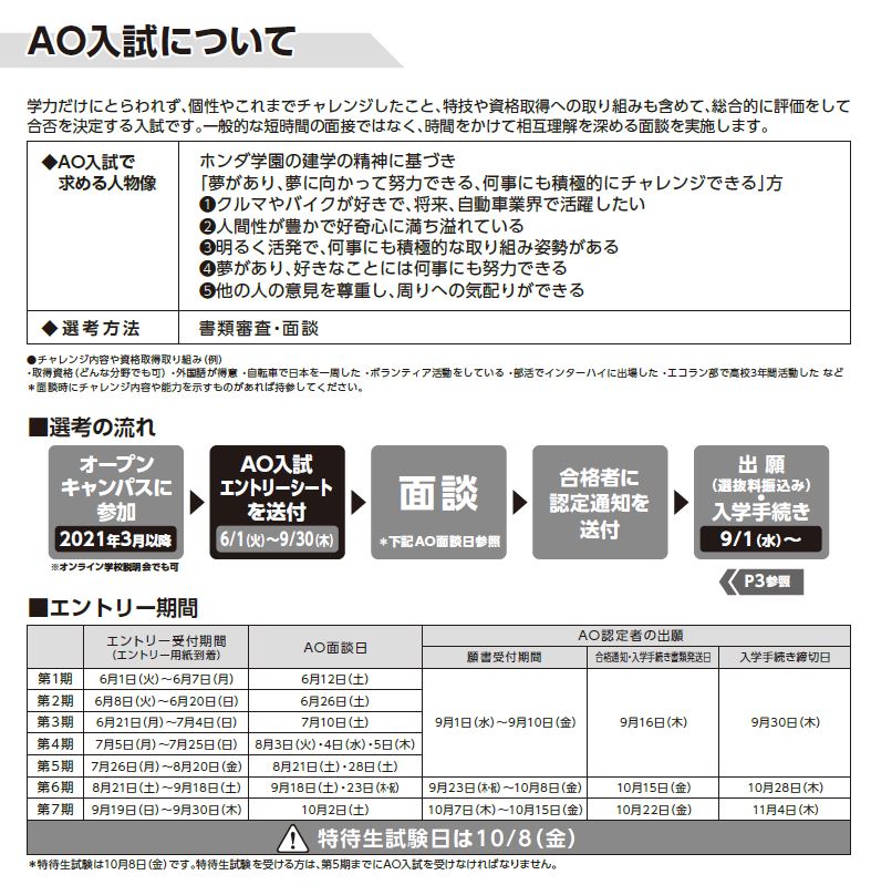 2022年4月入学生用の「AO入試」のエントリーの締め切りが2021年9月末となります。AO入試をご検討されている方はお早めにエントリー用紙をご送付ください。