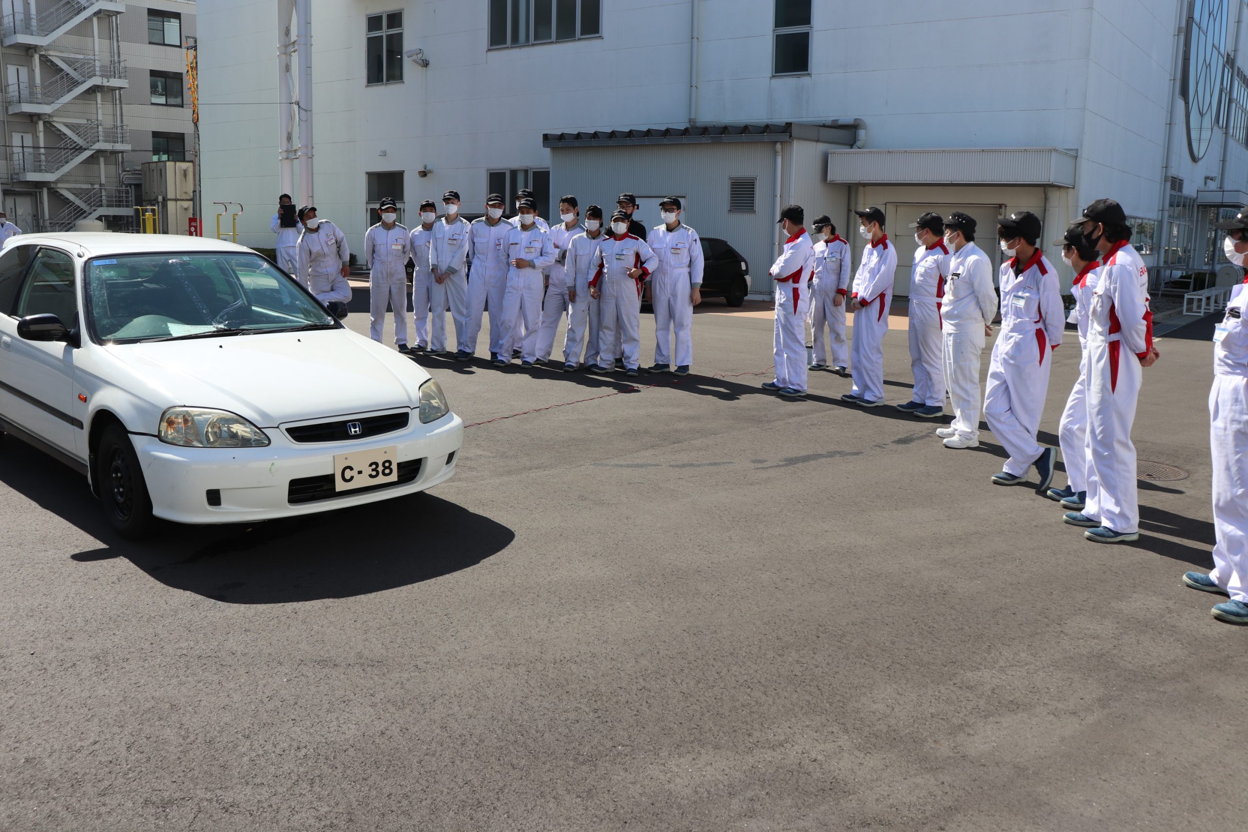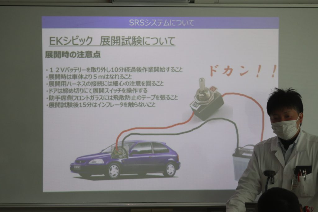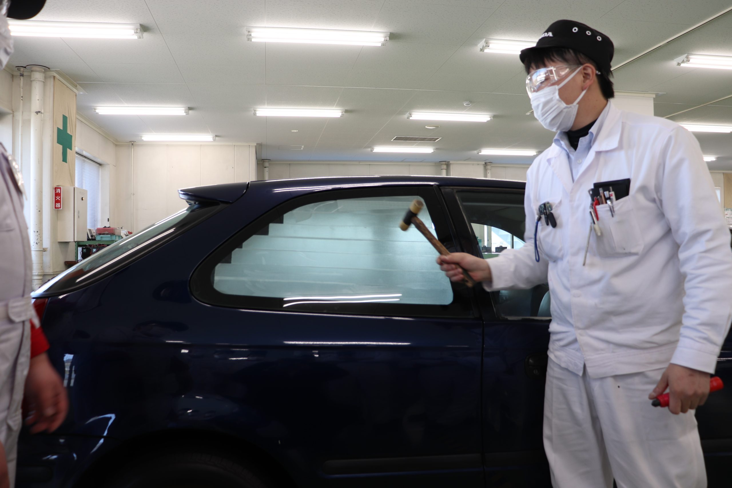 先日、実習車として廃棄になる車両を使い、なかなかできない体験授業①エアバッグの展開と➁緊急脱出時の車両ガラスの粉砕の体験授業を実施しました。