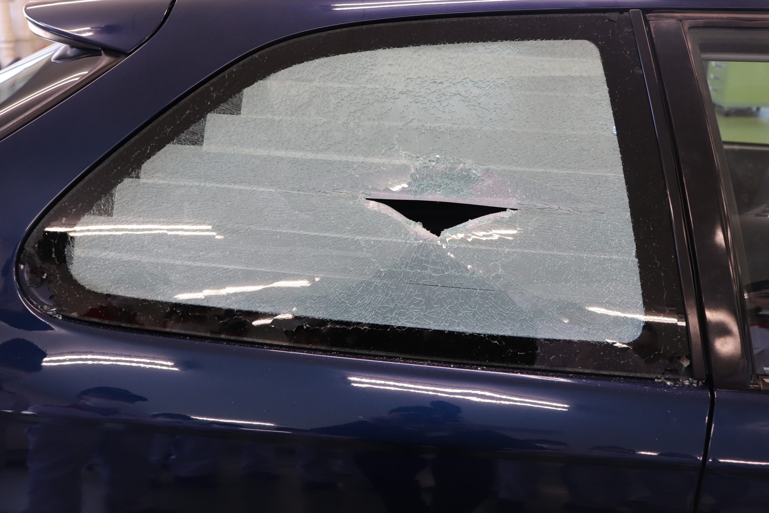 →車両に閉じ込められた人を救出する際、また、水中のクルマからの脱出時等に使用する、特殊工具を使っての窓ガラスの粉砕ですが、初挑戦の学園生ばかりなのでなかなか力の入れ具合が分からなく、何度かチャレンジをして、やっと成功しました。