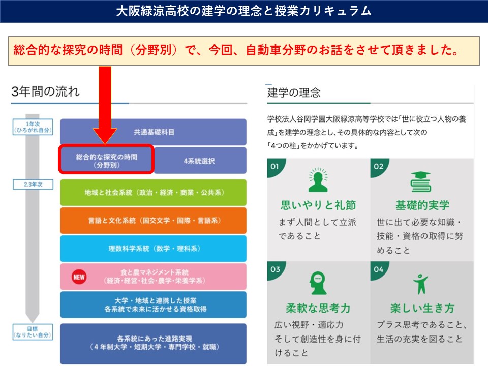 11月4日(水)に大阪藤井寺市にある大阪緑涼高校で、出前授業を実施させていただきました。授業には、1年生約100名と先生が参加してくれ、「自動車業界の概況・今後の変化・職種紹介・仕事のやりがい・企業が求める人物像・文理選択のポイント等」進路探究に繋がるお話をさせていただきました。みなさん最後まで、熱心に聞いてくださり、誠にありがとうございました。