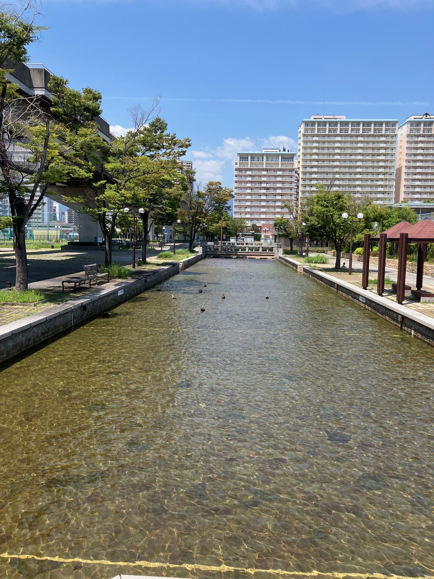 ■六甲アイランド高等学校の正門前風景(小川があり、鴨が羽を休めていました。)