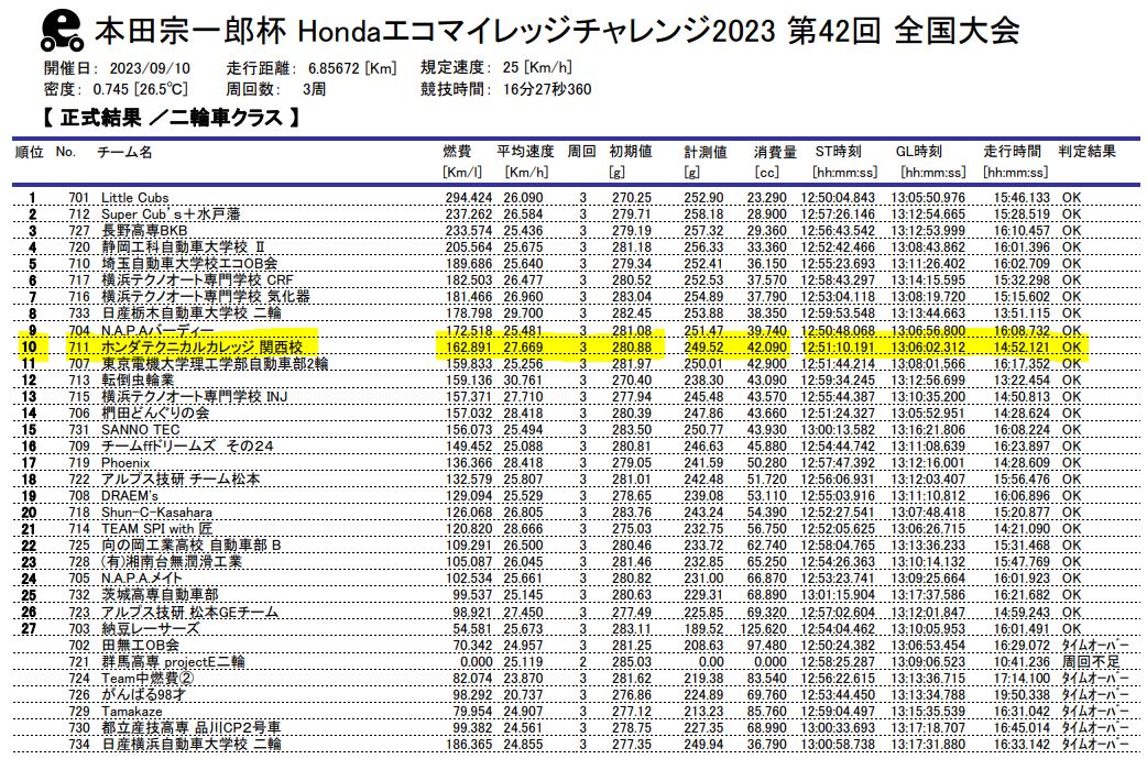 決勝の結果は、10位で平均燃費162.891㎞/Lとなり、昨年より順位・燃費ともに落としてしまいました。今年の結果をしっかり検証をした上で、来年の地区・全国大会での挽回に繋げていきたいと思います。
