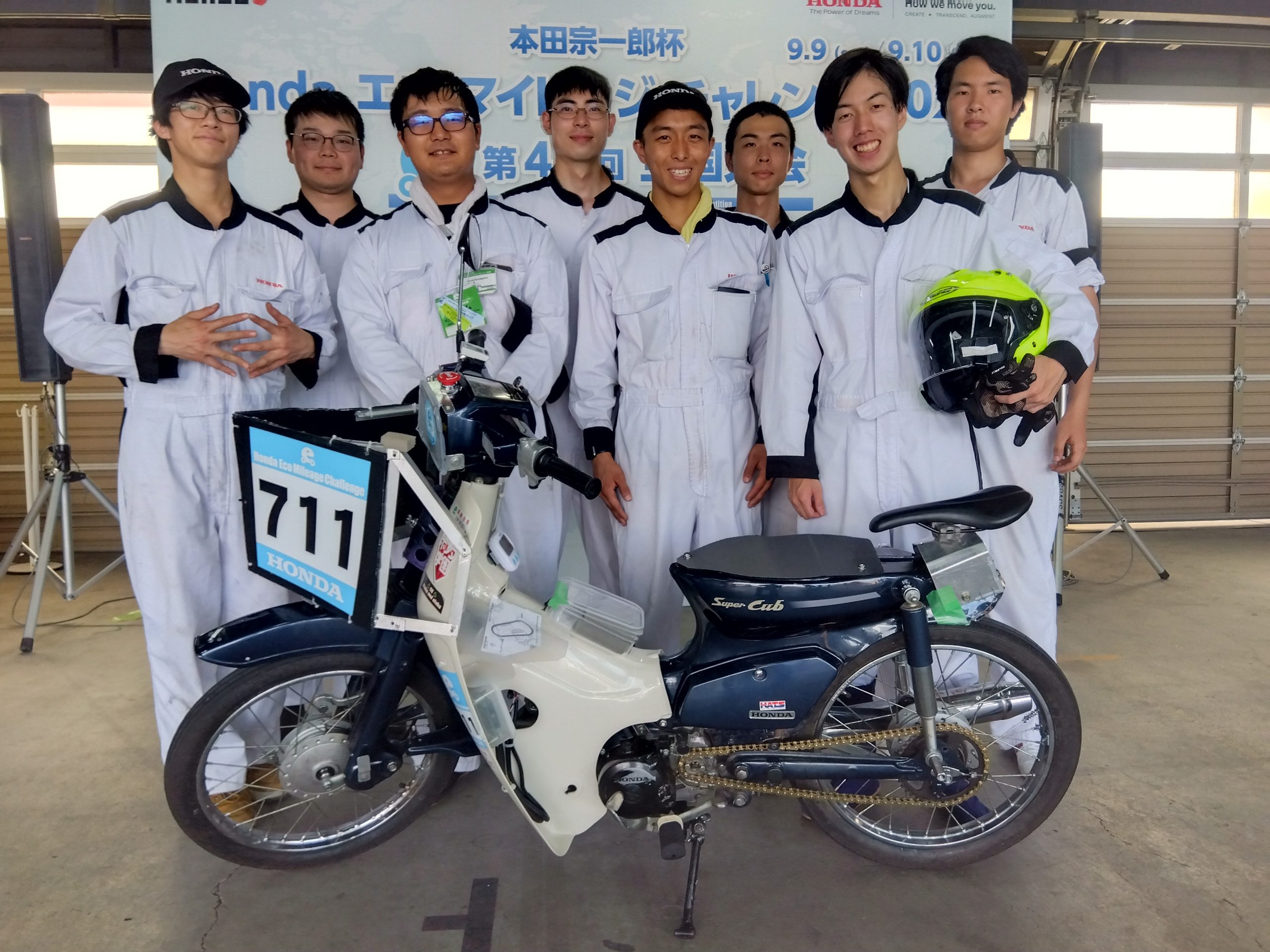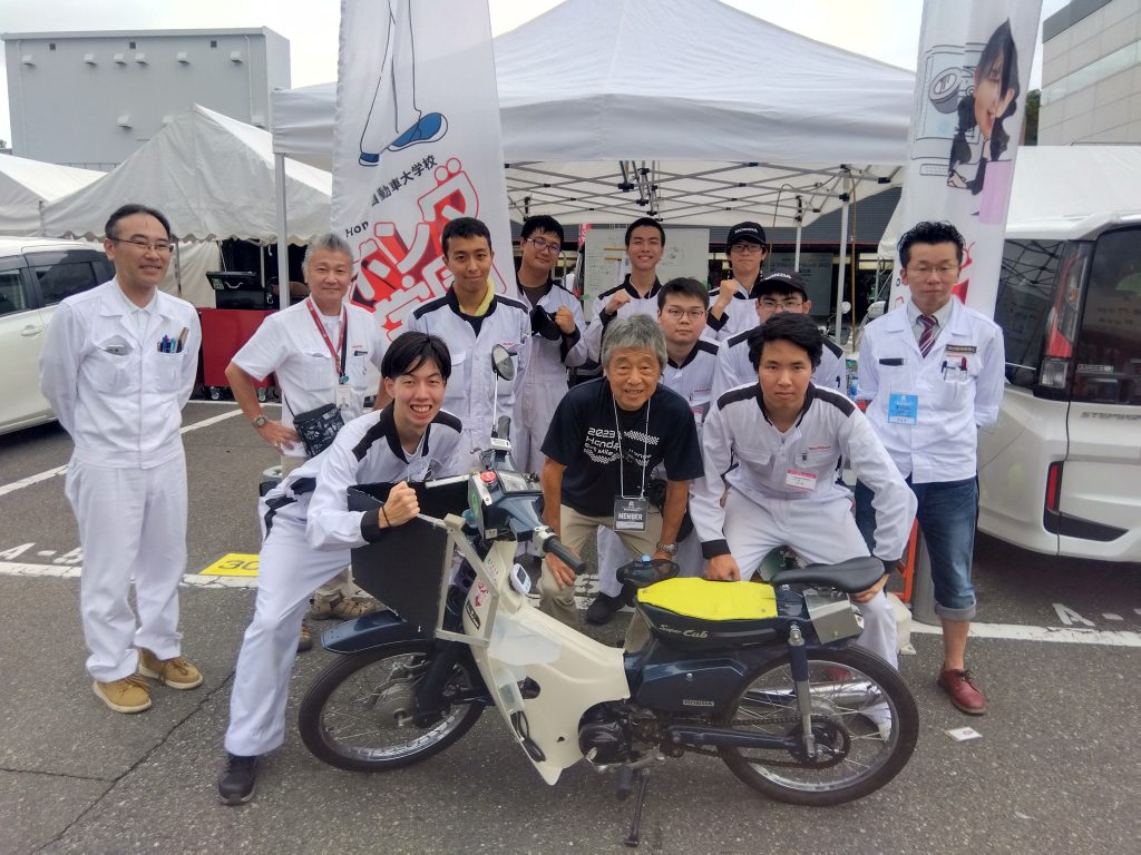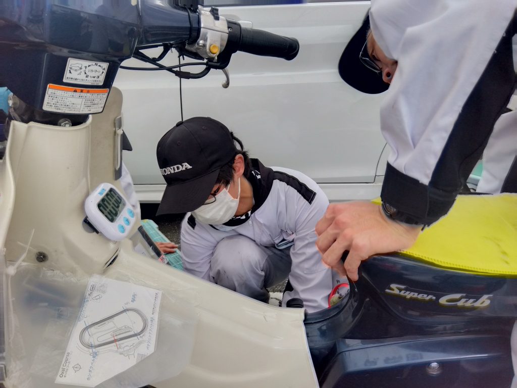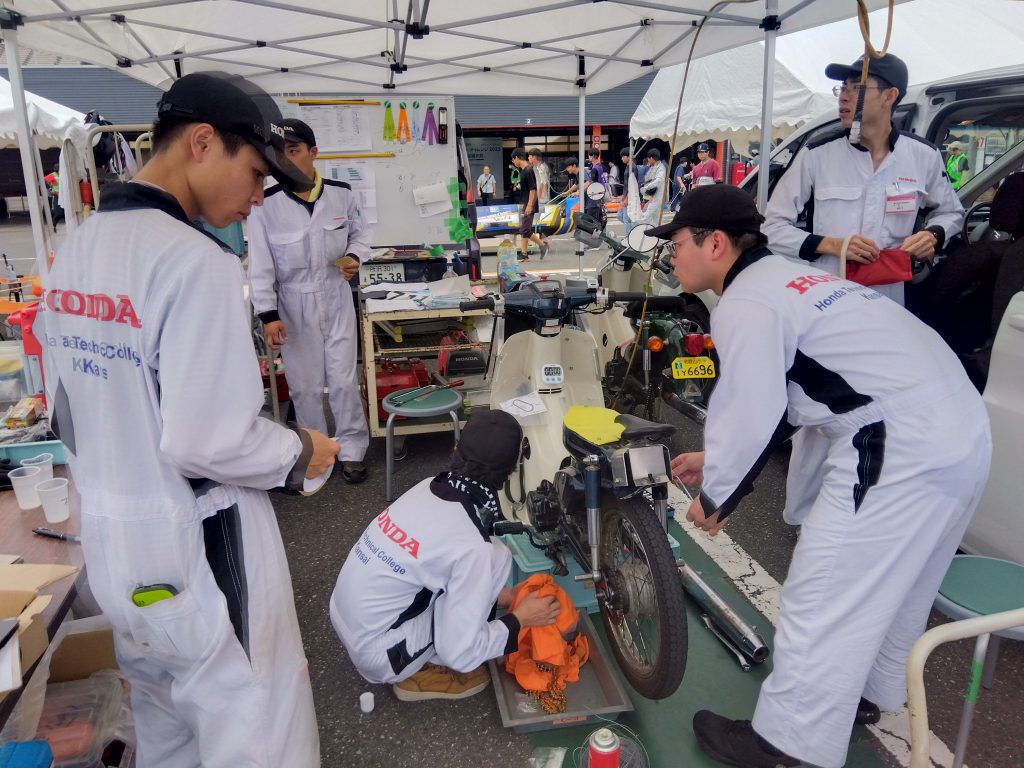 9月9日(土)、10日(日)に栃木県のモビリティリゾートもてぎで開催されたHondaエコマイレッジチャレンジ2023「本田宗一郎杯 第42回全国大会」にエコラン同好会が2輪車クラスへ参戦しました。台風が近づいている中での前日移動でしたが、無事に宿泊先へ移動ができ、翌日の9日(土)は走行ラインや平均スピード、周回数カウントの確認などを行いました。また、移動中・宿泊先でも、決勝に向けての意見交換を活発に行いチーム力が更に上がっていました。10日(日)の決勝レース前まで、もう一度出来る所はないかと見直し、少しでも記録を伸ばそうとする姿に学生の成長を感じました。