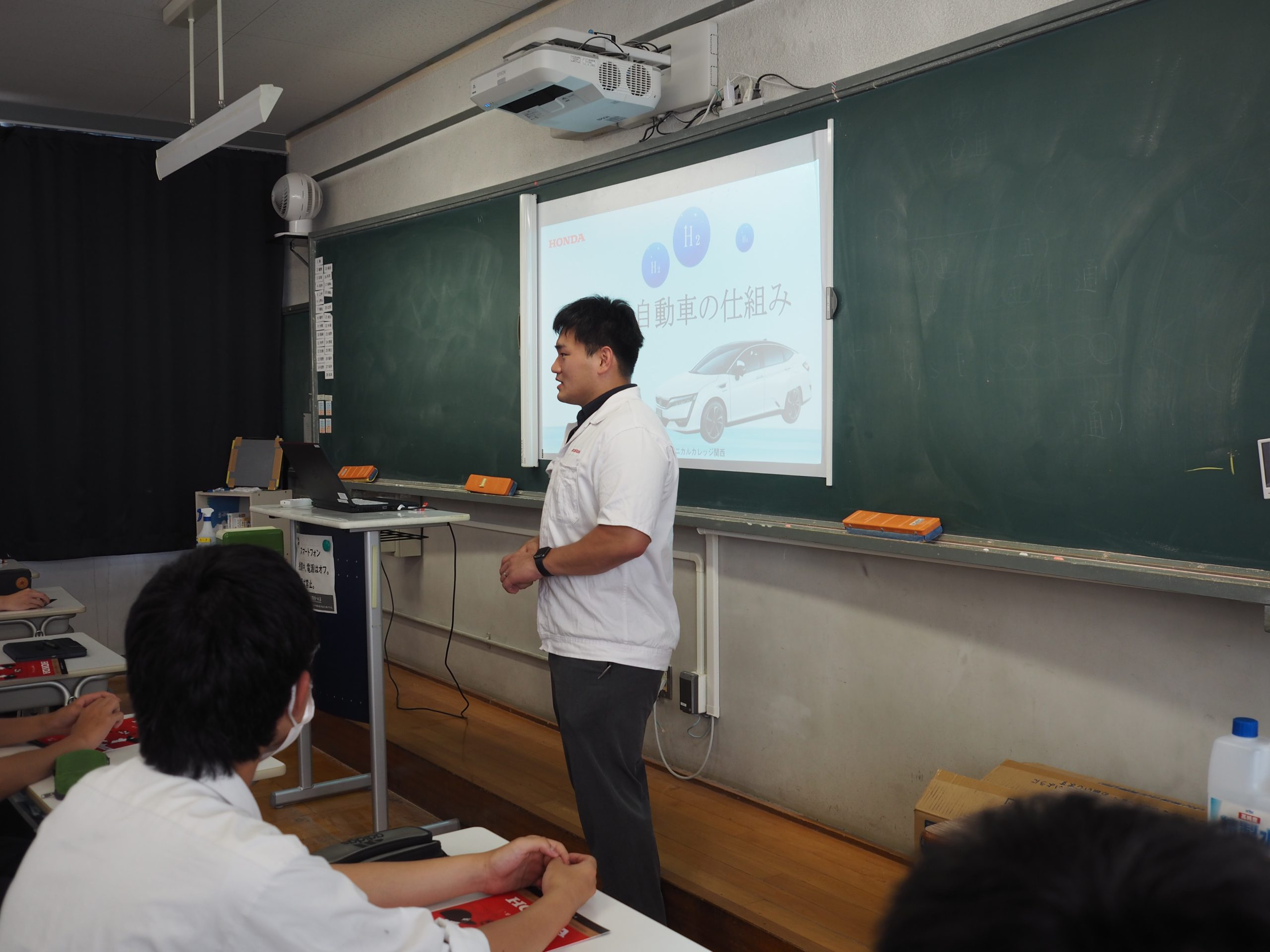 7月7日(金)京都府の亀岡高等学校2年生30名へ「未来エネルギー水素を学び、次世代自動車の仕組みを体験」の出張授業を実施させて頂きました。
