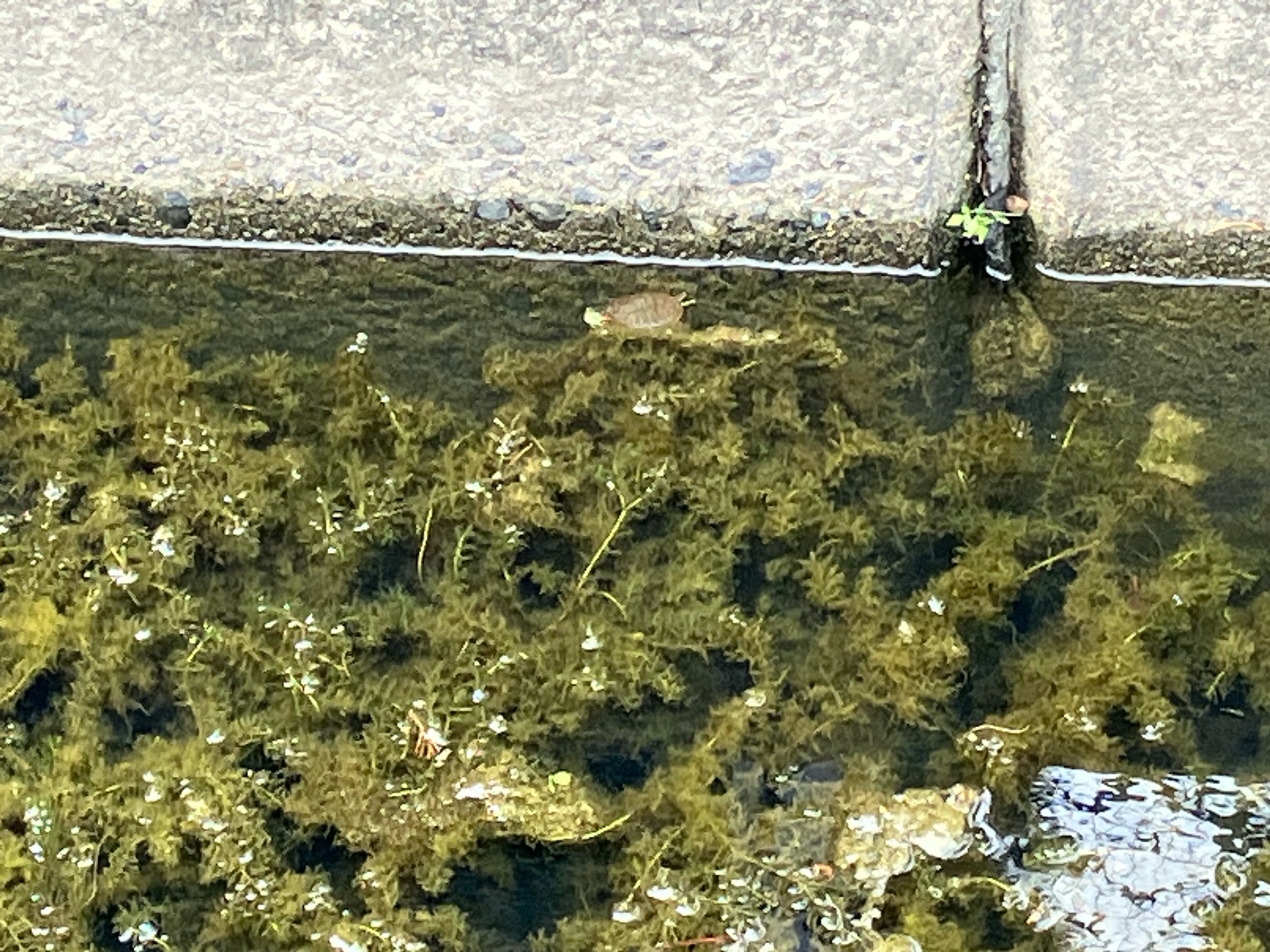 学校の用水路に可愛いミドリガメの赤ちゃんが太陽に向けて、顔を出していました(^^)/