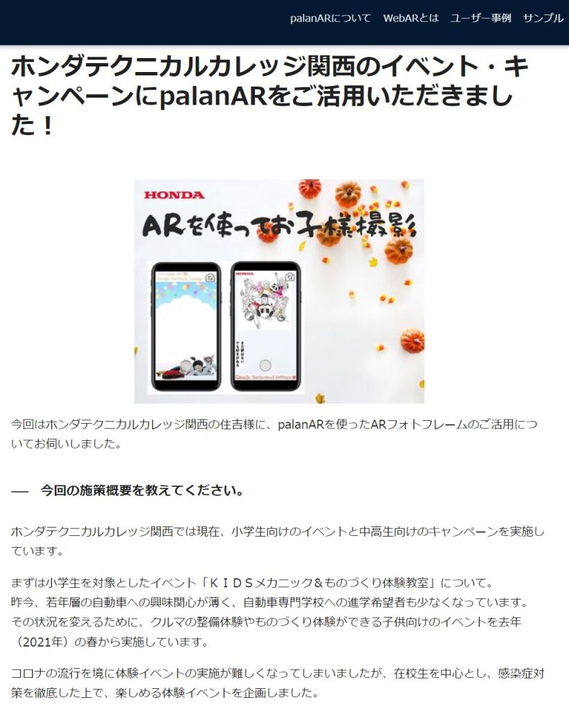 本校で実施している「KIDSメカニック&ものづくり体験教室」でARを使ったスマホでのお子様の記念撮影を6月より実施しています。今回はそのAR「palanAR」のサービス提供会社である、株式会社palan様から取材を受け、palana様のホームページで活用事例として取り上げて頂きました。(#^^#)