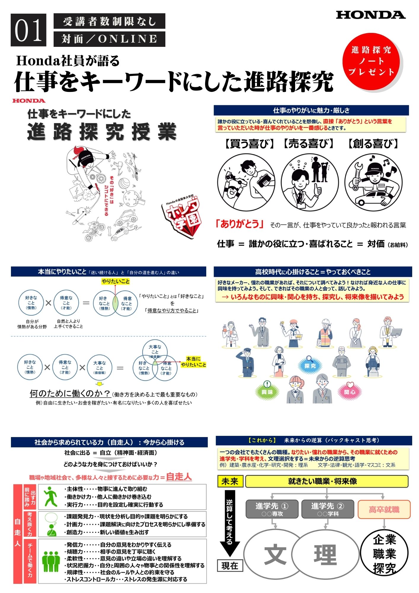 Hondaの自動車大学校では、西日本の中学・高校向けに4つの出前授業(無料)をご用意しております。 2022年度から必修化となった「総合的な探究時間」にぴったりな「①進路探究授業」、家庭科での金融授業にも使える「②18歳までに学ぶ 夢を叶えるお金の使い方」、経営者視点を理解し、起業の第一歩「③ビジネス養成力講座:商人頭の磨き方」、未来エネルギー水素を学び「④燃料電池車の仕組みを学ぶ」の計4本です。