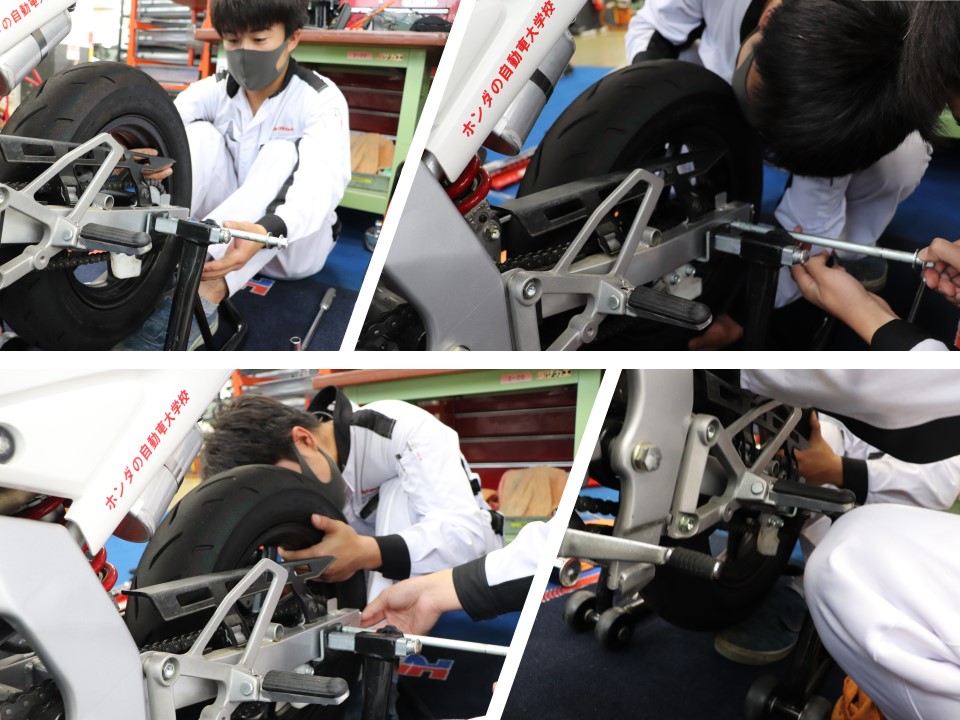 二輪整備同好会では、現在、レース車両、「NSF100」と「HRC GROM」のスポーツ走行(サーキット走行)前の点検・整備を 行っています。