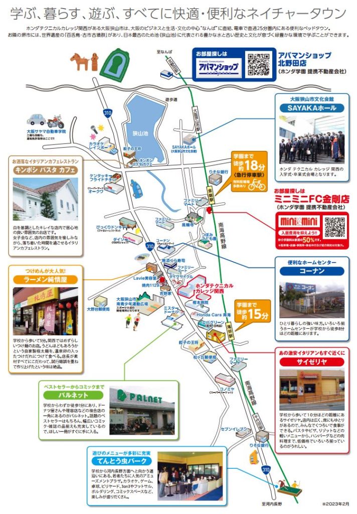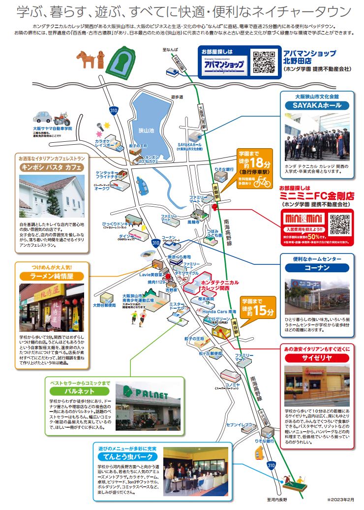 ホンダテクニカルカレッジ関西がある大阪狭山市は、大阪のビジネス・生活・文化の中心”なんば”に直結、電車で約25分圏内(乗り継ぎなし)にあるベッドタウンです。また、学生の街(大学・短大・専門学校がたくさんある)になっており、一人暮らし用のワンルームの物件も豊富で家賃もリーズナブルです!なんと、月:3万円台~あります!!