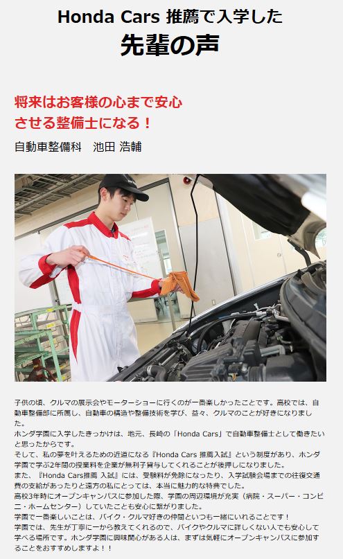 【在校生紹介】『Honda Cars推薦』を選び、進学した池田さんの声