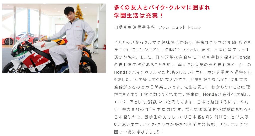 HPの在校生紹介コーナーに、新たに自動車整備留学生科1年生の「ファン ニュット トゥエン」さんを追加掲載いたしました。ファンさんは、小さな時からクルマに興味関心があり、日本へ留学し、日本語を学んだ後にホンダテクニカルカレッジにご入学されました。自らの夢「Hondaのエンジニアになって活躍する」を叶えるため、一生懸命、学園で勉強に取り組んでます。詳しくは、下記の在校生紹介コーナーに他の在校生とともに掲載しております。
