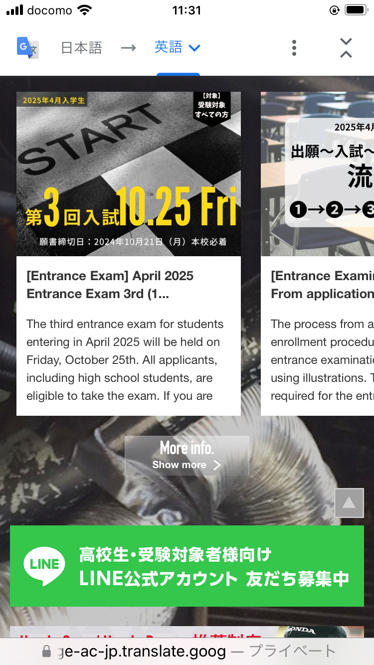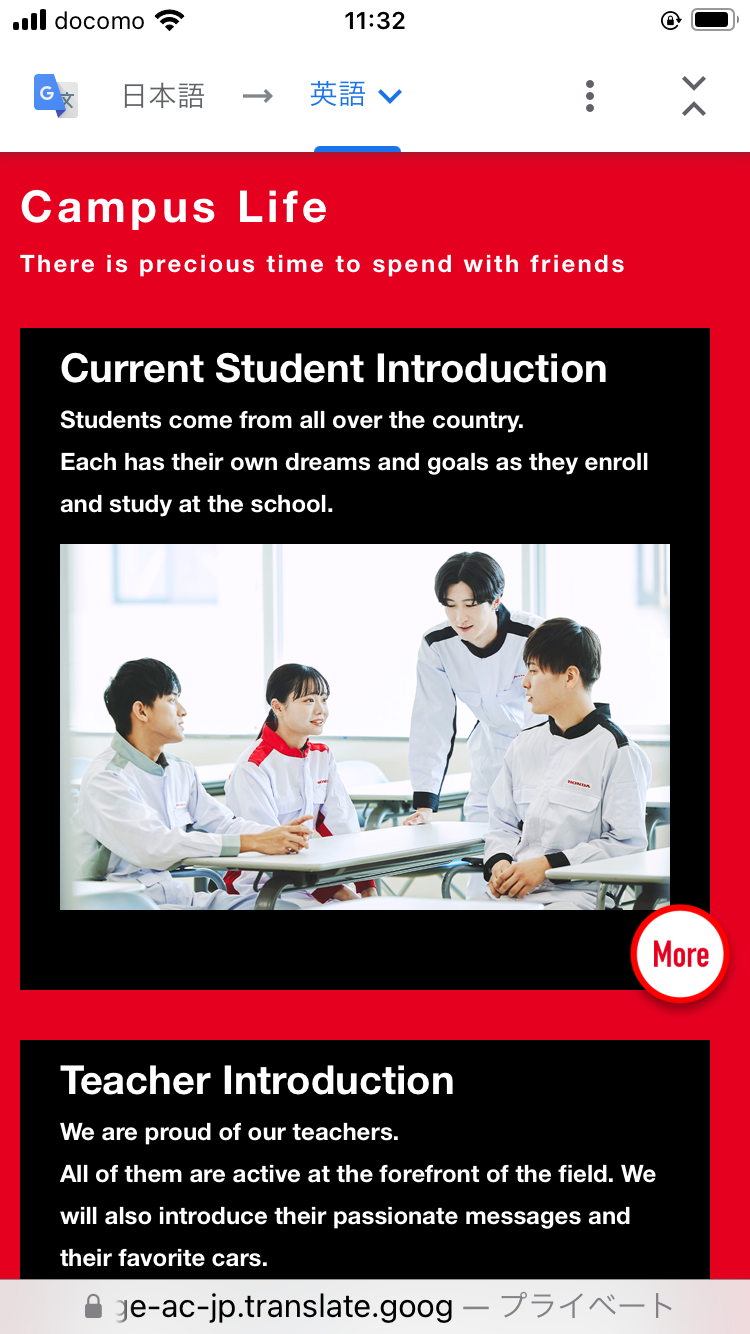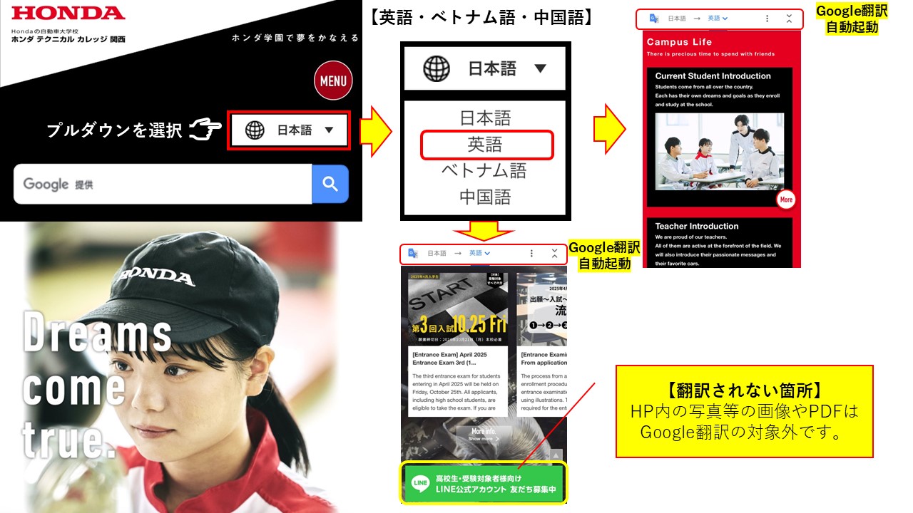 Googel翻訳では、写真等の画像データやPDFは翻訳ができませんが、それ以外のメニューや説明については翻訳の対象となります。海外から本校へのご入学を検討している方、母国のご親族に本校を紹介したい方等、どんどん使ってください。※翻訳は、Google 翻訳を使用してますので、多少の翻訳間違いについては予めご了承ください。