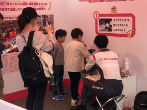 4月20日(土)、21日(日)の二日間、福岡県のマリンメッセB館で開催されたHondaのイベント=Enjoy Honda福岡のKIDSメカニック体験ブースにて、学園生が体験される方のサポートおよびステージ上で博士の助手と学校紹介をさせていただきました。天候は二日間ともにあいにくの雨模様とはなりましたが、Enjoy Honda福岡には、約7,600人ものお客様がご来場し、その内、KIDSメカニック体験ブースには739名ものご家族連れが来ていただきました。多くのご家族連れと交流をすることができました(#^^#)。