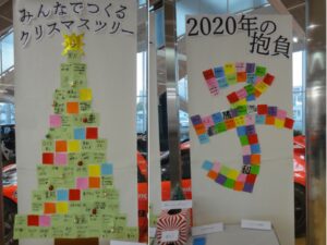 ガーデニング同好会が準備していた1Fのショールームのオリジナルのクリスマスツリーと2020年の抱負ボードがついに完成しました。