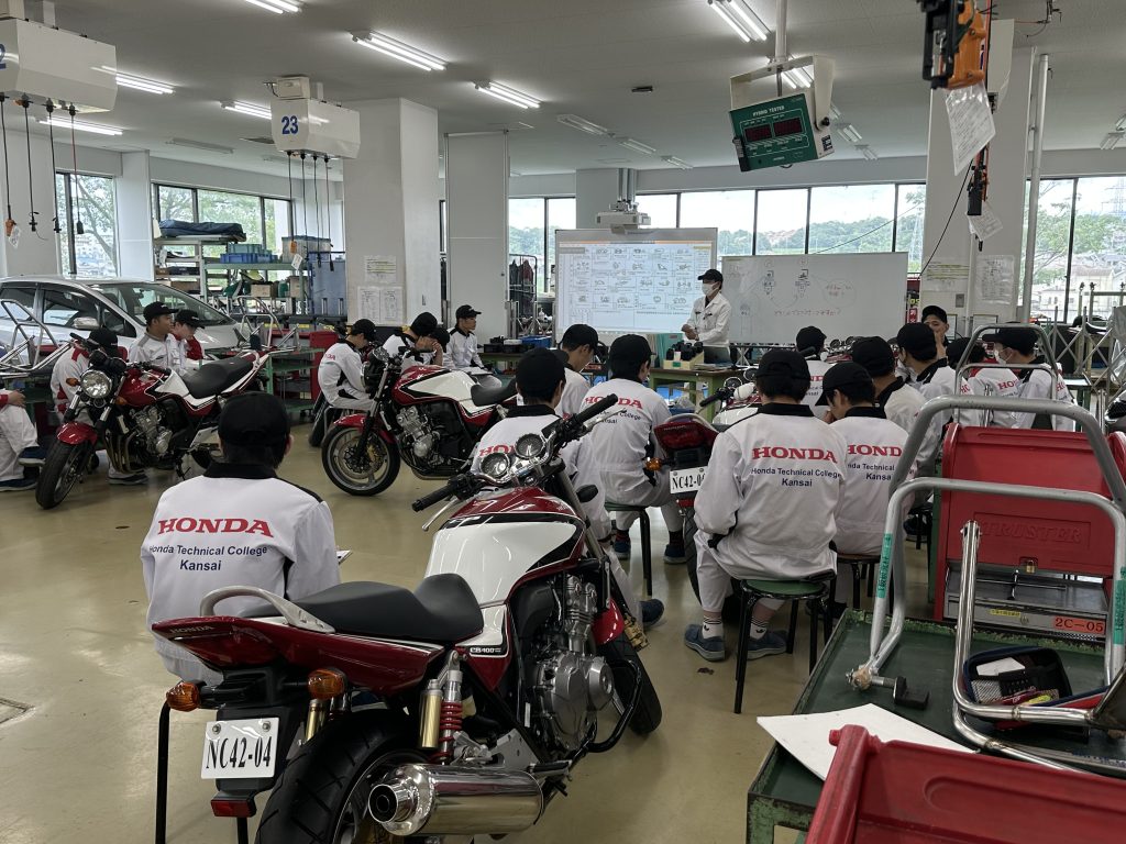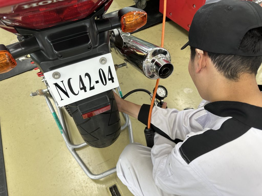 6月22日(木)に自動車整備科と一級自動車研究開発学科の2年生が、今年度から授業に追加した『二輪車の12ヵ月点検』を実践形式で実施しました。まずは、12ヵ月点検で使用する整備記録簿の記入方法を再確認し、教材車のCB400を使って12ヵ月点検を実施しました。点検終了後は、お客様役の学園生・教職員に整備内容を分かりやすく・丁寧に説明しました。
