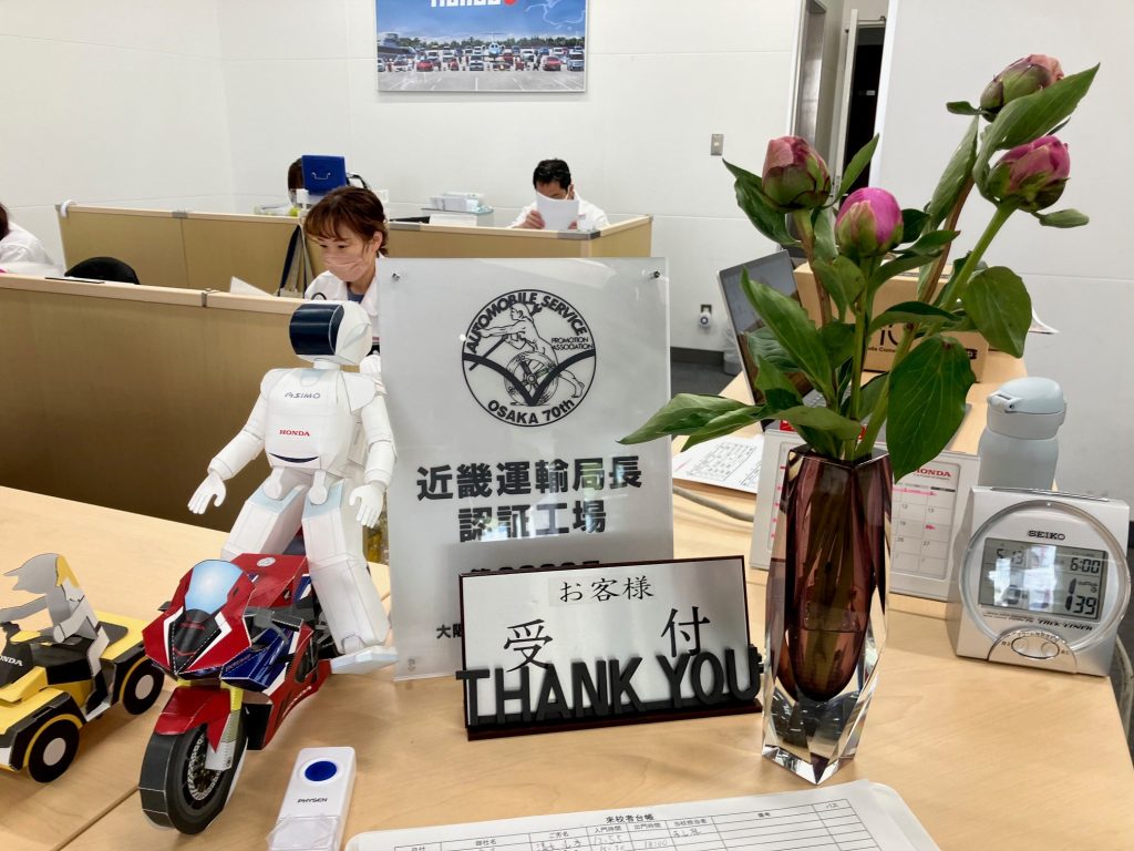 富山県の八尾中学校3年生4名の生徒が、西日本への修学旅行中に、社会見学として本校に訪れてくれました。当日は、学校説明に施設案内・授業見学を実施しました。また、綺麗な生花をいただき、早速、受付に飾らさせていただきました。その他にも八尾市の伝統、おわら風の盆のポスターもいただきましたので、HONDAロゴの下にしっかり掲示させていただきました。(#^^#)この度は、ご来校誠にありがとうざいました。