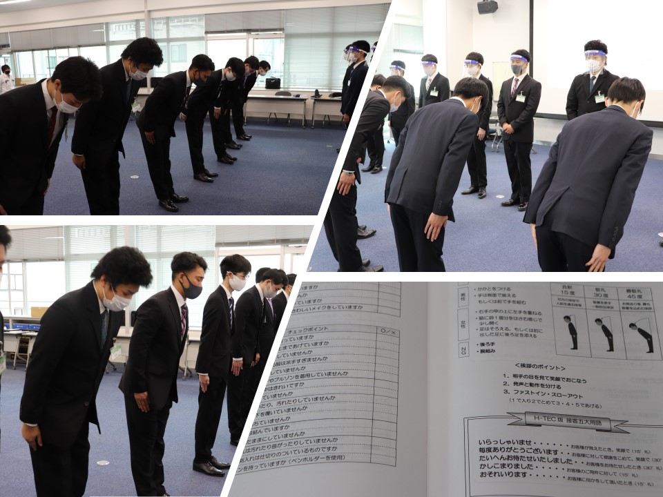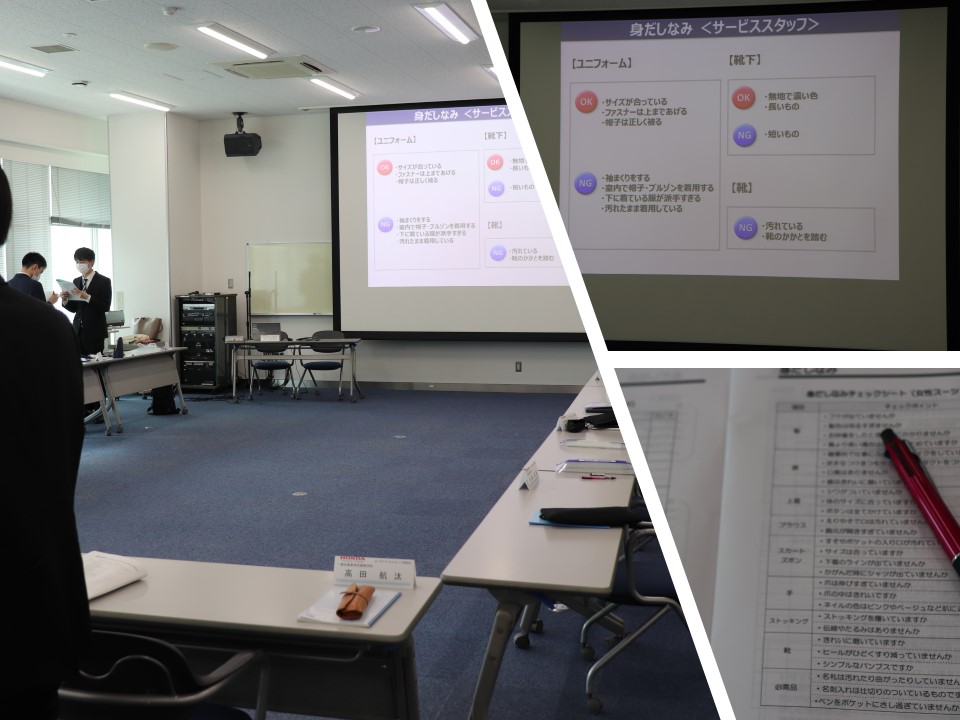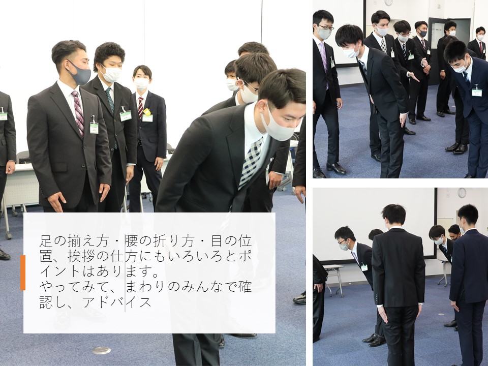 研修の狙い:これまでに身に付けたマナーを見直すこと、また社会人に求められる接遇マナーを理解し、体得すること。