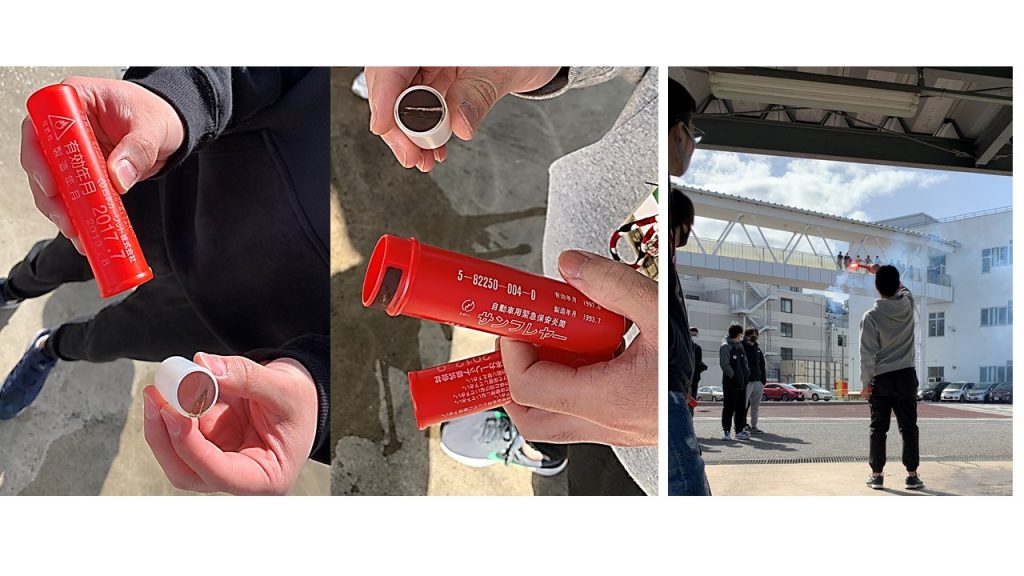 車に乗る人は一度は目にしたことがある、赤い筒、発炎筒。事故や車が故障したときに使うもの、という認識はあると思いますが、実際どう使うの…?ということで実際に学生自身で点灯実習をしてみました。発炎筒には、有効年月、という使用期限が設けられています。古いもの、新しいもので発火の仕方は違うのか、昼間でも離れたところから視認できるのかを確認していました。
