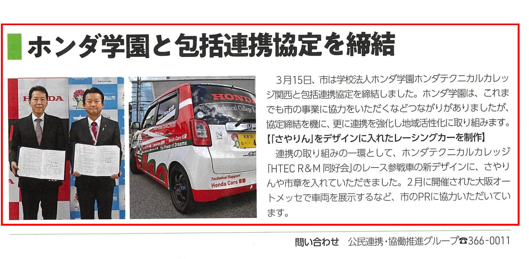 本校のある大阪狭山市の広報誌「広報おおさかさやま5月号」に3月15日に市と締結した包括提携の調印式および本校の部・同好会活動「H-TEC R&M部」のレースマシンを誌面に取り上げてくださいました。レースマシンには、大阪狭山市のマスコットキャラクターである「さやりん」と市章を前後に取り入れさせていただいております。(写真参照)